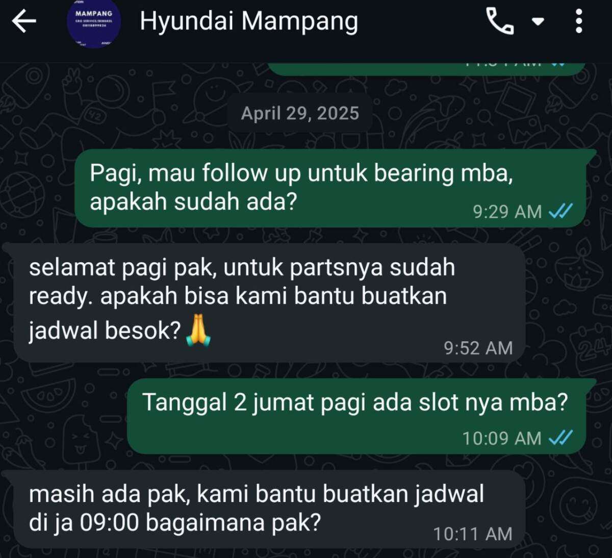 Mohon kepada Hyundai untuk lebih profesional, memberikan kualitas yang baik, dan mempertanggungjawabkan poin nomor 8. Beli mobil bekas saja belum tentu bolak-balik bengkel. Ini sudah bolak-balik, tetap tidak selesai.