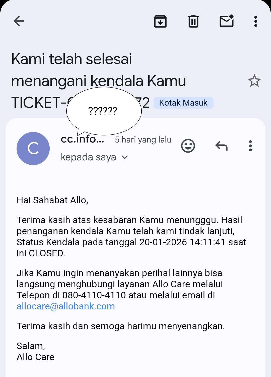 Ujungnya, diberikan nomor laporan, lalu oke saya tunggu. Dari laporan pada tanggal 8 > 20 Januari dinyatakan closed.