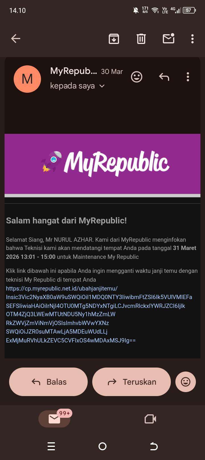 Saya baru menyadari internet mati saat pulang mudik pada tanggal 24 Maret 2026, dengan kendala router berkedip-kedip merah (LOS). Saya langsung melapor ke CS MyRepublic dengan tiket pelaporan 14515354 dan dijanjikan teknisi datang pada tanggal 25 Maret 2026 pukul 09.00–11.00. Teknisi tidak datang sesuai waktu yang dijanjikan, sehingga saya menghubungi CS lagi dan meminta bantuan sales pada sore harinya untuk follow up nomor pelaporan 14515354 ke tim teknisi.