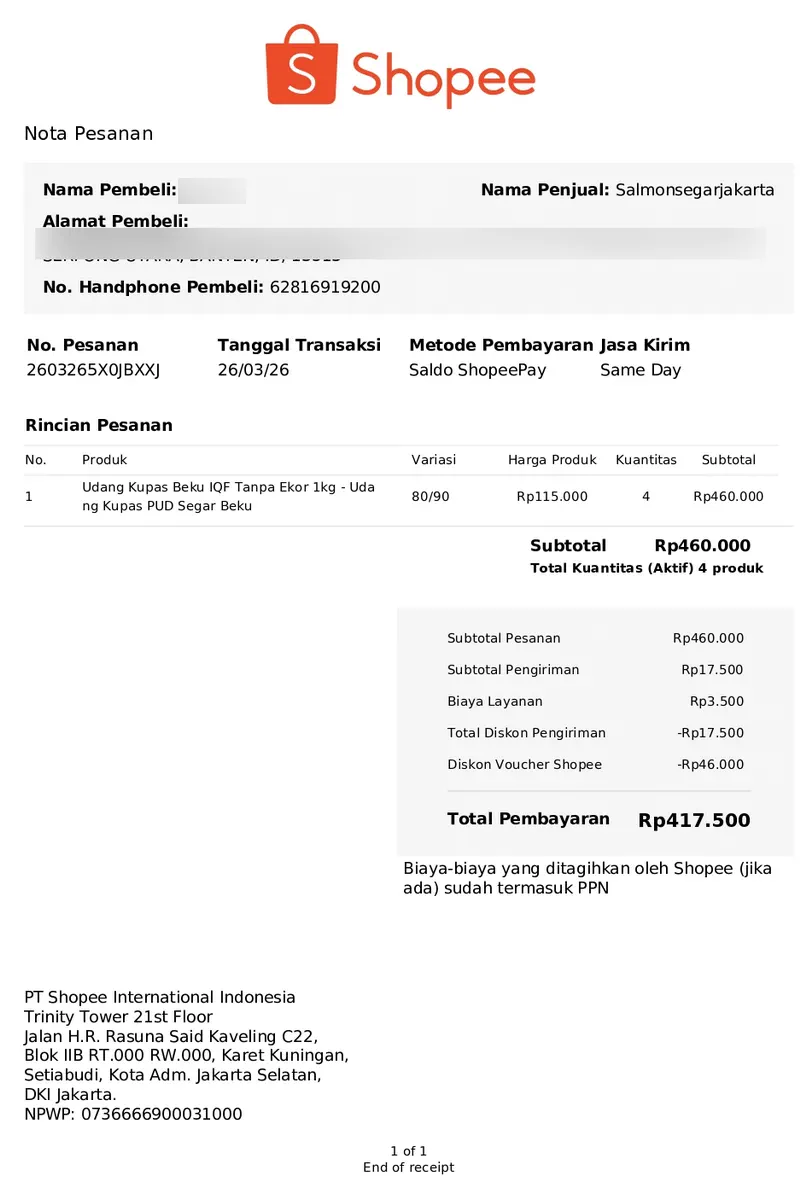 Setelah mendapatkan jawaban tersebut, saya langsung melakukan checkout payment dengan nomor order 2603265X0JBXXJ, pilihan variasi 80/90 (sebanyak 4 pcs/4 kg) dengan menggunakan layanan kurir same day. Namun ketika barang saya terima, ternyata malah sebaliknya, ukuran udangnya adalah yang terkecil (bukanlah ukuran yang terbesar sebagaimana yang saya harapkan). Artinya di sini jawaban AI Shopee telah menyesatkan saya.