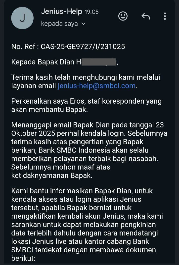 Jenius SMBC Indonesia Memblokir Rekening Secara Sepihak Sehingga Nasabah Tidak Bisa Log In