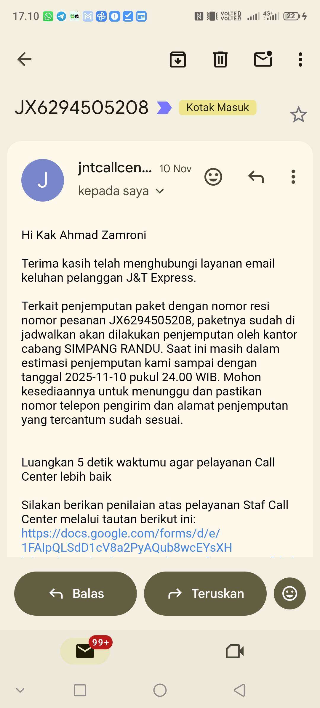 Saya berharap dengan terbitnya surat ini agar J&T Express dapat memperbaiki kinerjanya agar tidak dibuang lagi saat bekerja sama dengan Shopee, dan pihak TikTok Shop agar lebih tegas terhadap ekspedisi.