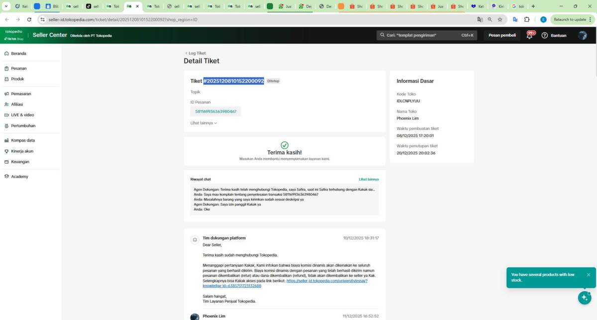 Saya adalah pemilik toko Phoenix Lim di TikTok Shop Tokopedia dan saya ingin berbagi pengalaman berjualan di platform ini. Dulu, sebelum diambil alih oleh TikTok, saya merasa nyaman berjualan di Tokopedia karena ada Tokopedia Care yang bisa dihubungi dan selalu sigap menangani jika terjadi masalah. Namun, setelah diambil alih, saya melihat kondisinya semakin buruk karena semuanya harus melalui chat.
