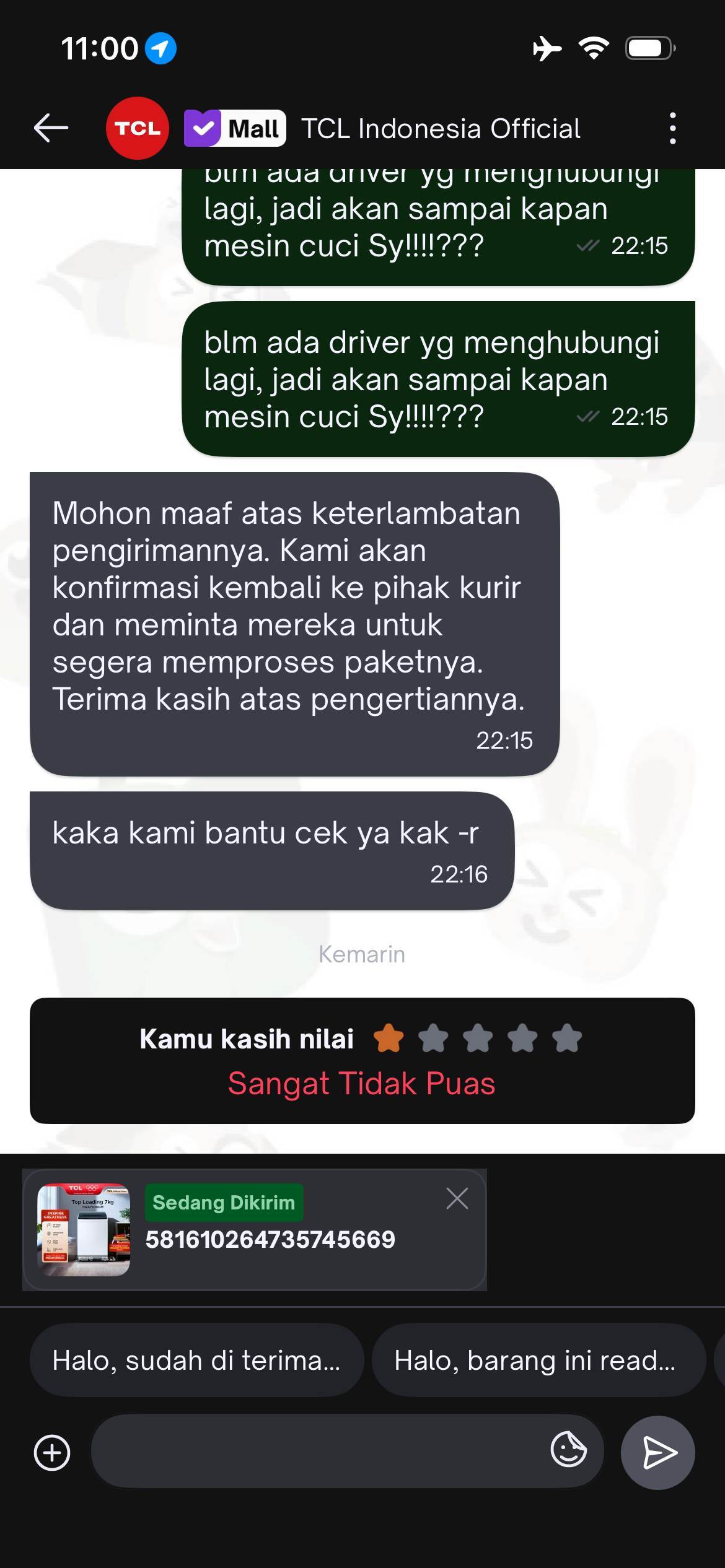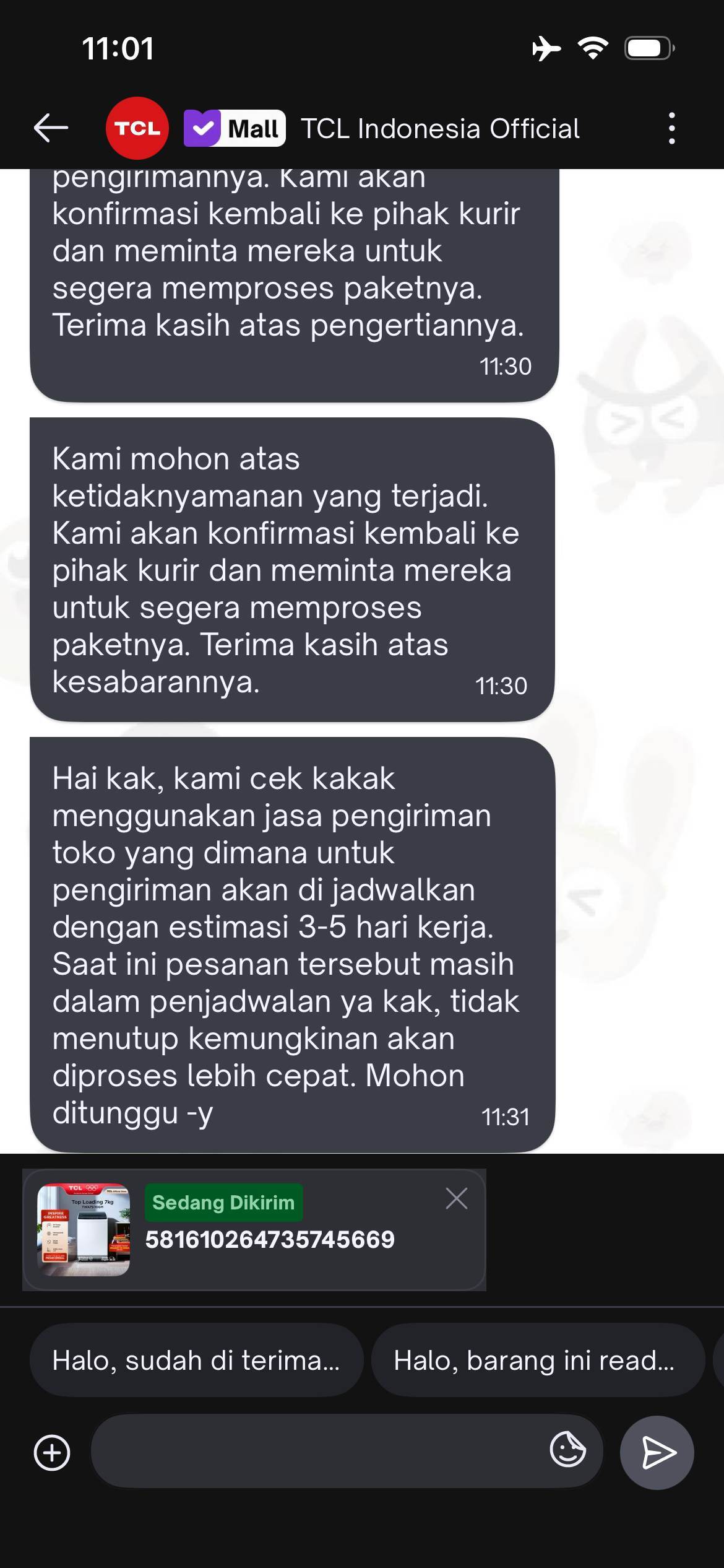 Saya chat ke TCL, tetapi hanya dijawab robot dengan jawaban yang sama, yaitu menunggu 3–5 hari kerja. Akhirnya saya berhasil mendapatkan chat WhatsApp customer service TCL, namun hasilnya tidak berbeda, hanya disuruh terus menunggu dan menunggu.