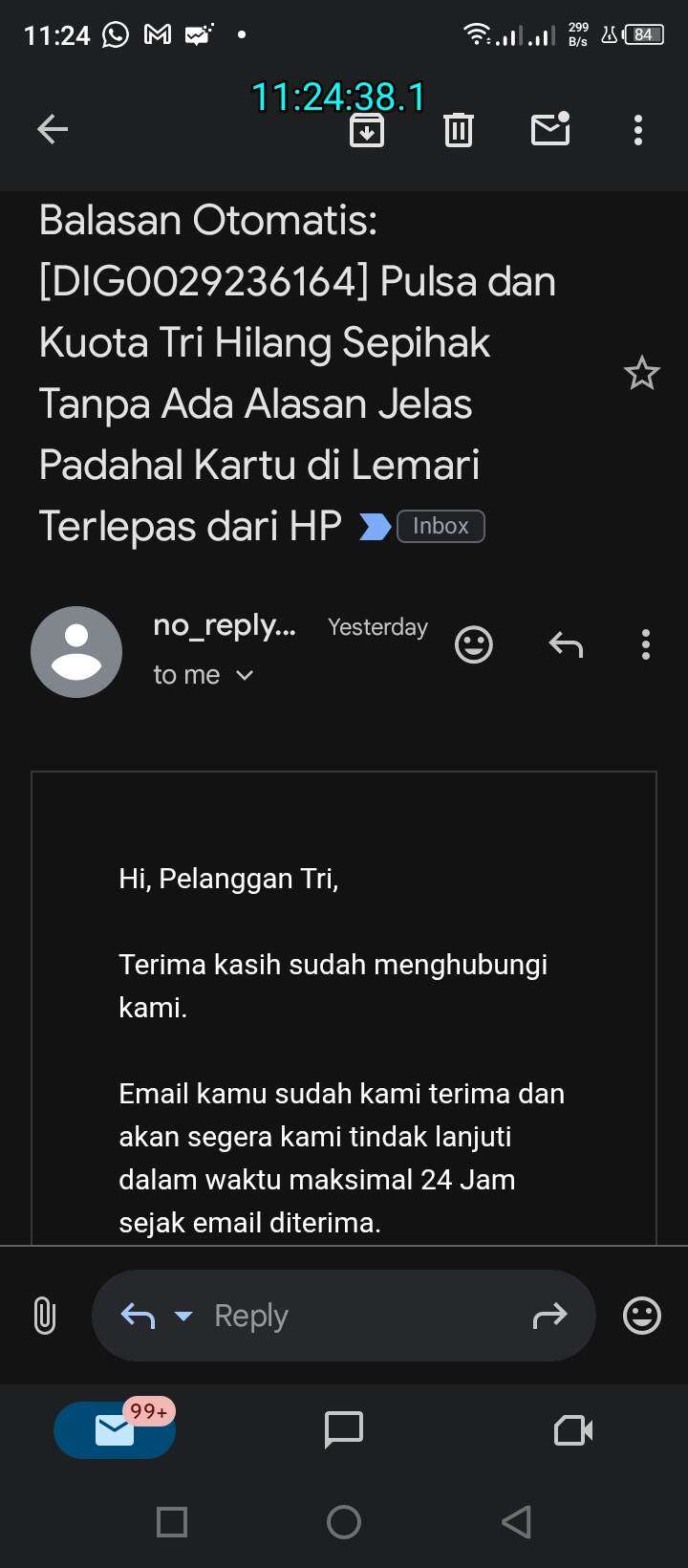 Saya minta penjelasan dan pengembalian sisa pulsa yang diambil sepihak oleh pihak Tri. Saya sudah mengeluhkan hal ini lewat email ke CS Tri di 3care@tri.co.id sebanyak 2x, hanya mendapat auto reply balasan otomatis saja, tidak ada jawaban dari CS dan mendapat nomor tiket laporan: DIG0029236164.