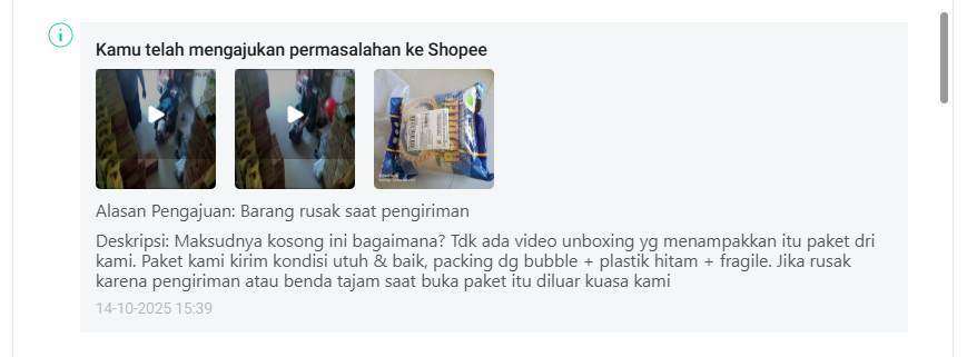 - Foto sebelum paket packing (menunjukkan jumlah produk dan resi) — syarat wajib dari Shopee untuk pengajuan banding.