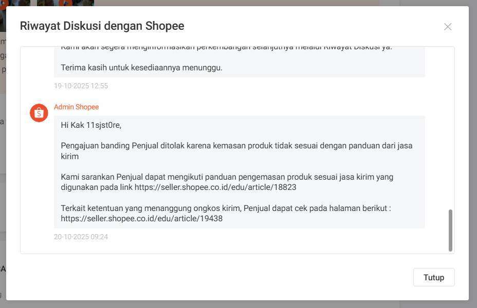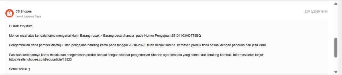 Karena merasa dirugikan, saya menghubungi customer service pada tanggal 21 Oktober 2025 untuk meninjau kembali pengajuan banding saya. Namun hasilnya nihil. Pada 22 Oktober 2025, saya menerima jawaban yang sama: banding ditolak karena packing tidak sesuai standar ekspedisi. Ingin rasanya marah, karena alasan yang diberikan tidak masuk akal.