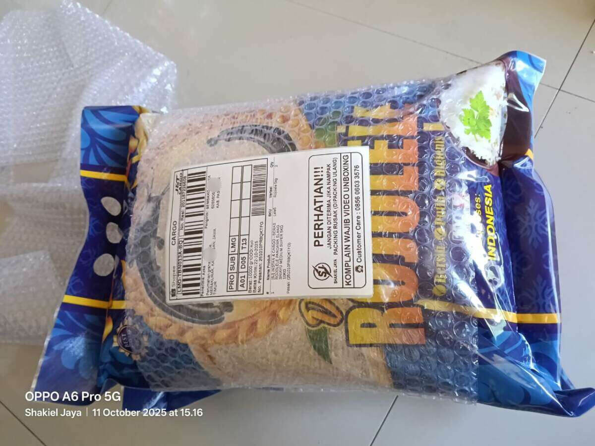 - Kerusakan pada foto tampak seperti akibat benda tajam (cutter atau gunting) saat membuka paket, dan beras di dalamnya masih jelas utuh. Namun nominal pengembalian yang diajukan senilai 5 kg beras.