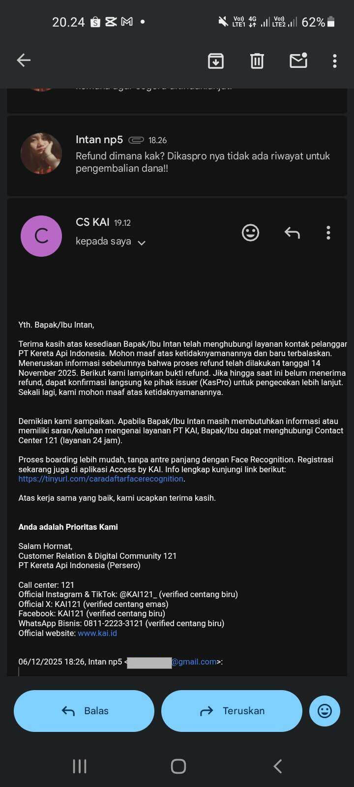 Well! Aku shock dong dapat email dari pihak KAI-nya langsung, ada bukti refund-nya juga. Tapi aku cek di aplikasi KasPro-ku masih belum ada riwayat transaksi masuk dana sejumlah tersebut. Terus aku cek di email KAI, informasinya jika belum menerima maka harus konfirmasi langsung ke pihak KasPro.