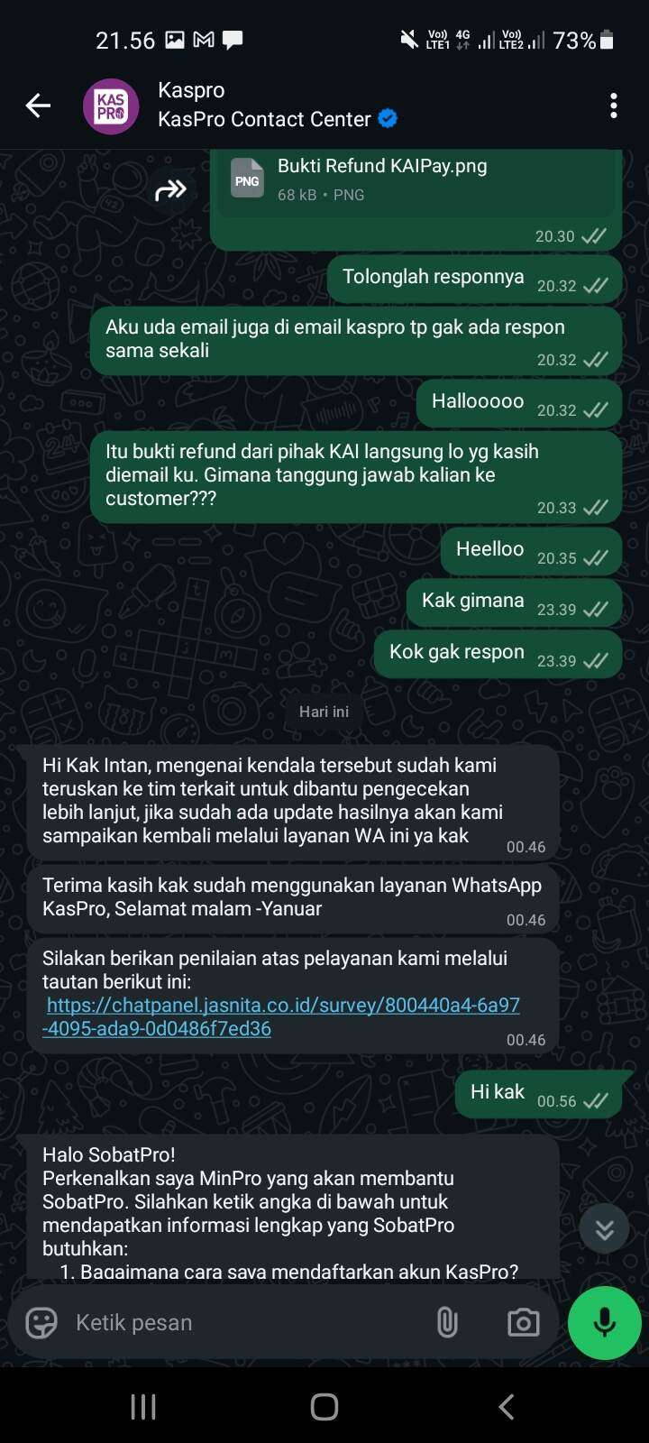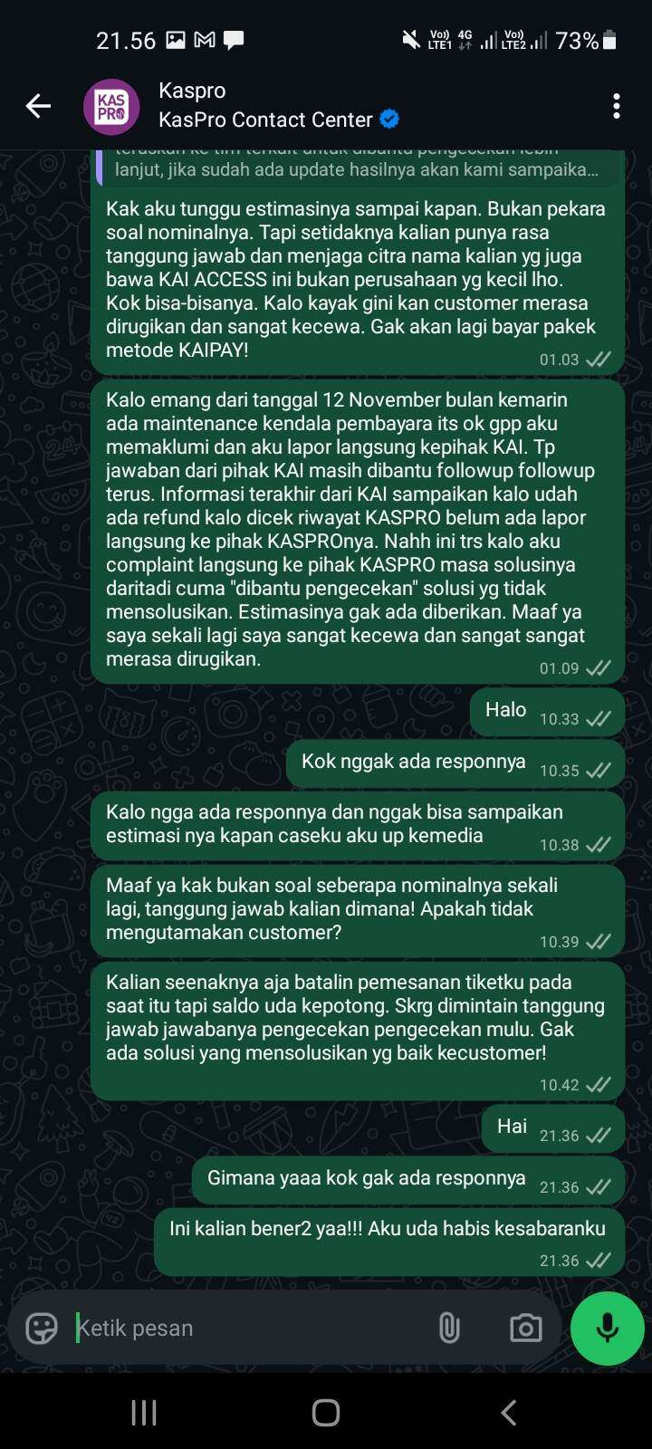 Anjir lah, gila, sudah sebulan nggak ada responsnya lagi. Sudah jelas-jelas bukti dari KAI aku sudah kirim. Maksudnya tuh bukan perkara soal nominalnya seberapa ya, cuma di sini KAIPay kan juga jadi satu dengan KAI yang di mata orang semua itu bukan perusahaan kecil. Jangan karena KAIPay yang buruk jadi KAI yang kena imbasnya.