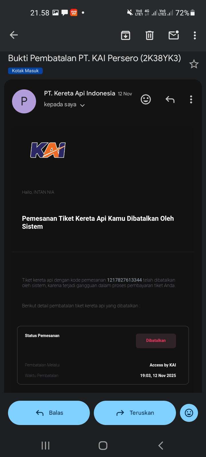 Jadi awalnya aku beli tiket kereta api dari Semarang–Solo di tanggal 12 November 2025. Kemudian pembelian tiket itu tiba-tiba gagal dengan keterangan di aplikasi/notifikasi email KAI yang aku terima: cancel order by system trouble.