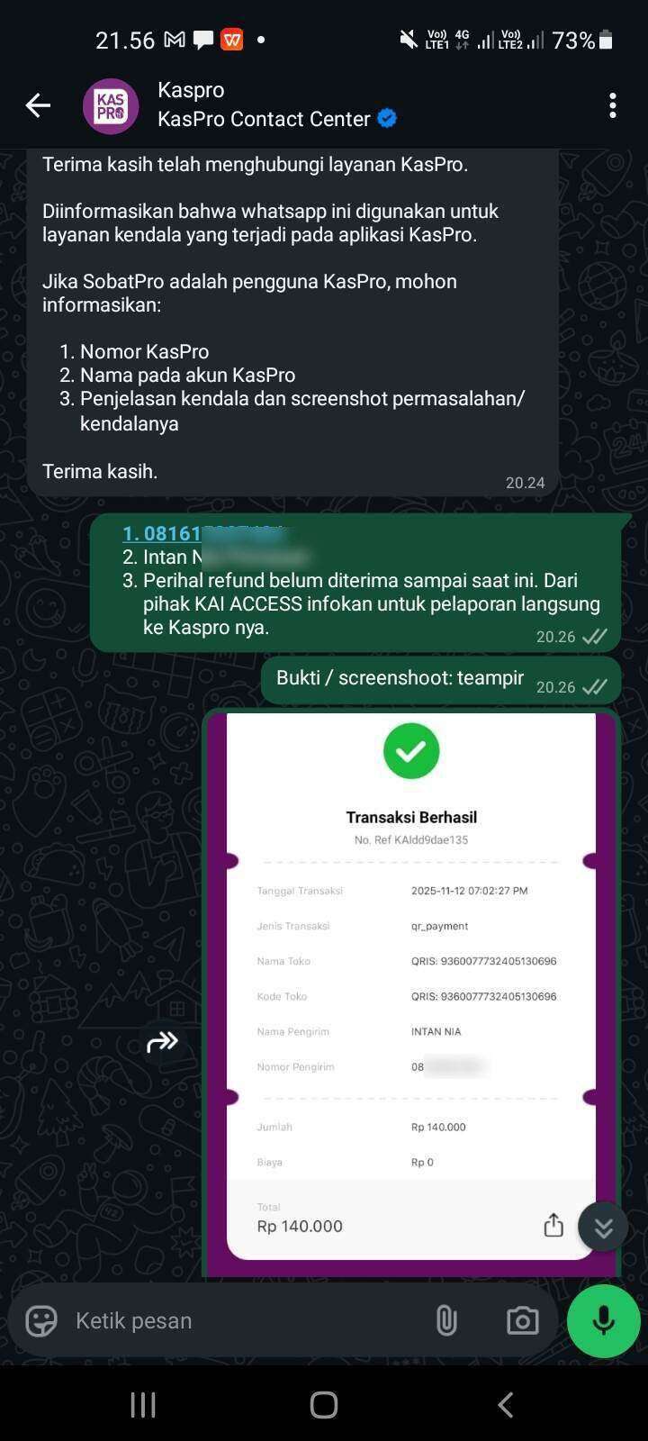 Oke, aku tunggu sampai sekarang di tanggal 7 Desember 2025, informasi terakhir dari pihak KAI menyampaikan kalau nominal saldo yang sudah terpotong senilai 140.000 itu sudah direfund ke pihak KAIPay/KasPro.
