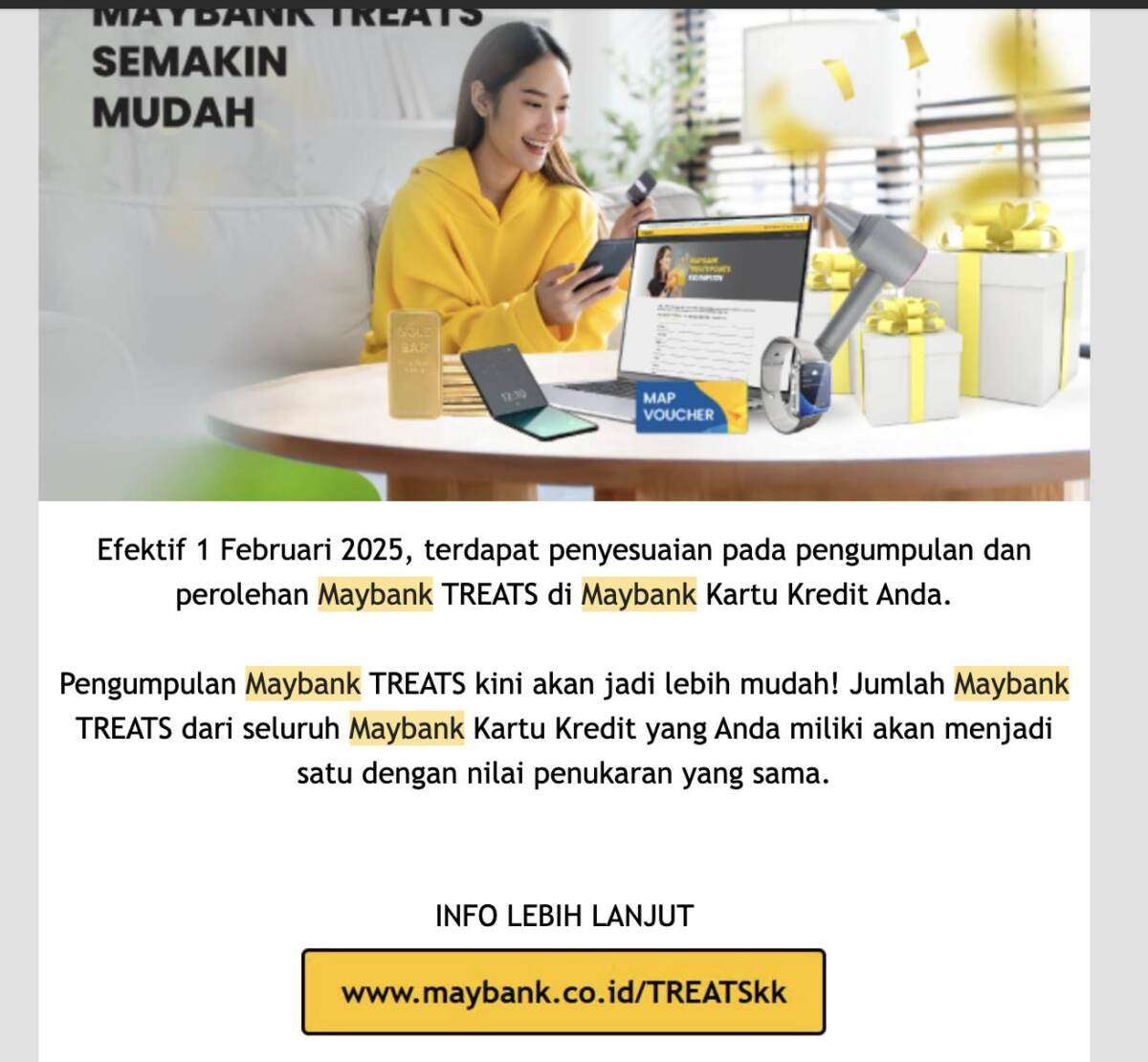 - Email pemberitahuan tidak menyampaikan informasi masa berlaku secara gamblang, melainkan fokus pada penggabungan Maybank TREATS Points.