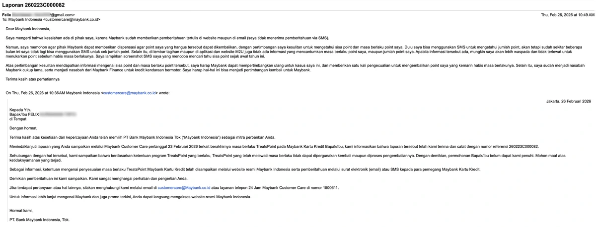 Saya Felix Kurniawan, nasabah setia Maybank Indonesia dan pemegang kartu kredit Maybank. Melalui surat pembaca ini, saya ingin menyampaikan kekecewaan mendalam atas cara Maybank menangani hangusnya Maybank TREATS Points saya yang terjadi pada bulan Februari 2026, serta buruknya komunikasi yang dilakukan pihak Maybank kepada nasabah terkait perubahan kebijakan masa berlaku Maybank TREATS Points.