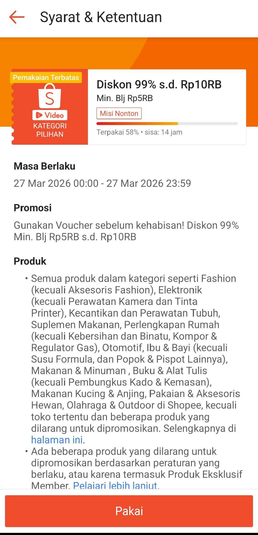 Tanggal 27 Maret 2026 saya mendapatkan voucher diskon Shopee 99% Rp50 ribu hasil dari menonton Shopee Video (screenshot terlampir).