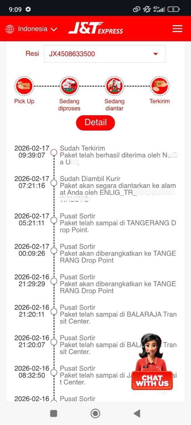Sesuai instruksi sengketa, saya telah mengirimkan kembali unit TV tersebut kepada TCL dengan nomor resi: JX4508633500. Berdasarkan pelacakan kurir, barang telah dinyatakan diterima oleh pihak TCL (Nur*** U**) pada tanggal 17 Februari 2026.