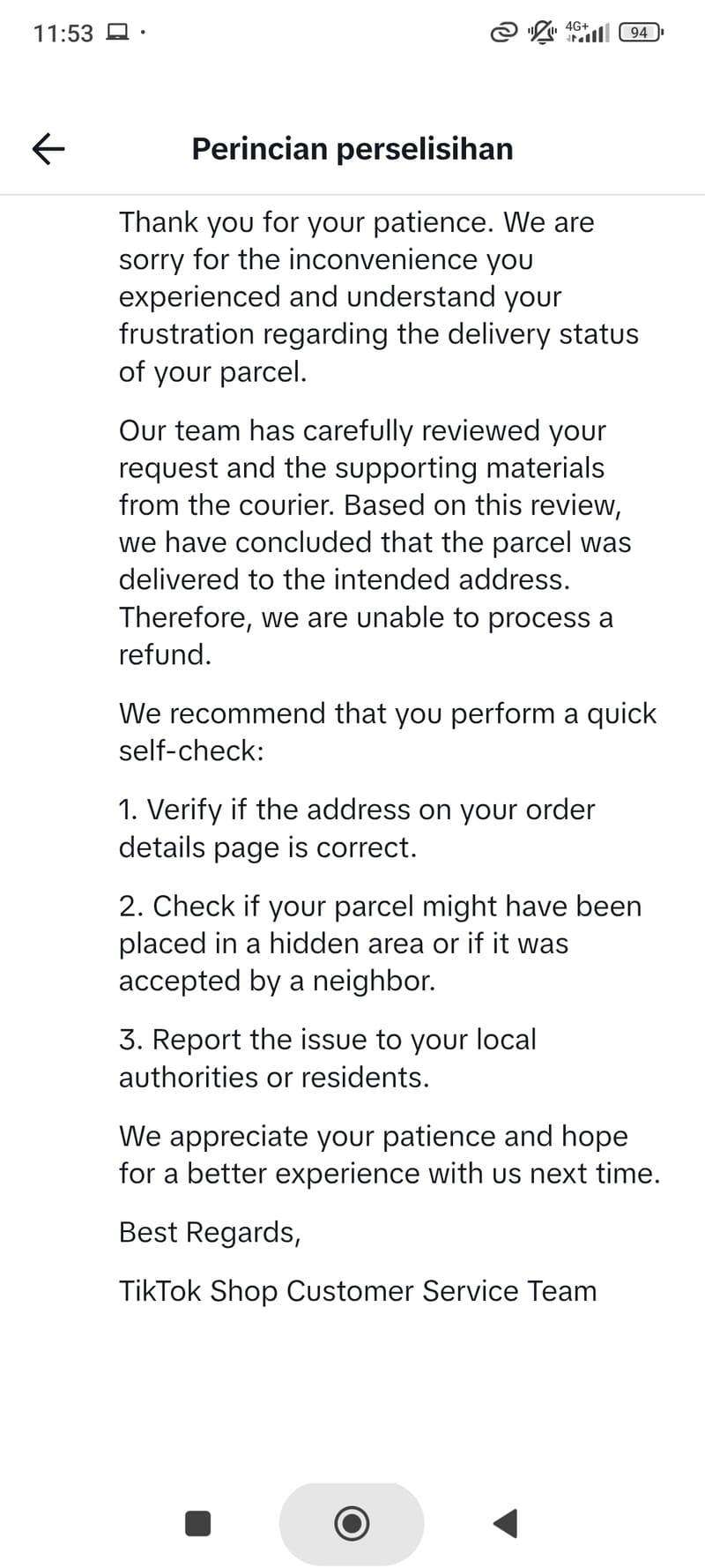 Saya sudah mencoba menghubungi Customer Service TCL, namun hanya diberikan jawaban template untuk terus melakukan banding ke TikTok Shop. Di sisi lain, sistem TikTok Shop tidak memberikan solusi manual padahal bukti pengiriman balik sudah jelas.