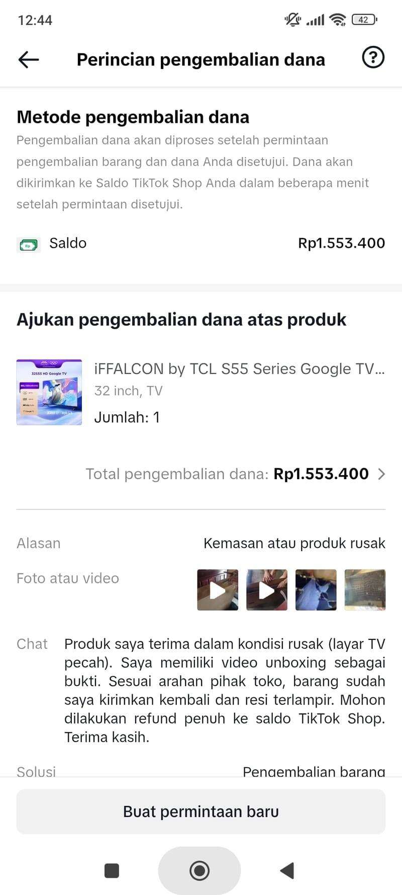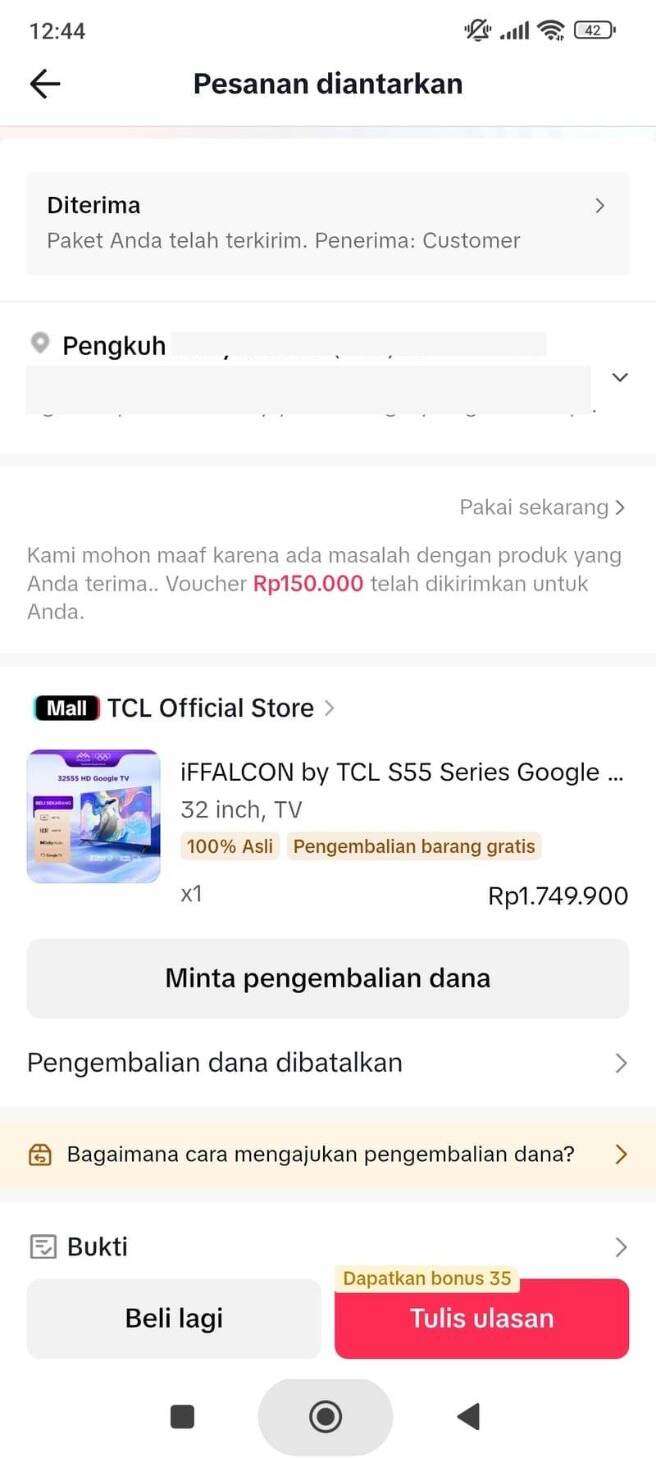 Saya meminta pihak TCL Indonesia dan TikTok Shop untuk segera melakukan koordinasi manual guna mencairkan pengembalian dana (refund) saya. Saya memiliki bukti lengkap berupa video unboxing, video saat pengemasan kembali (packing retur), dan bukti penerimaan barang oleh penjual.