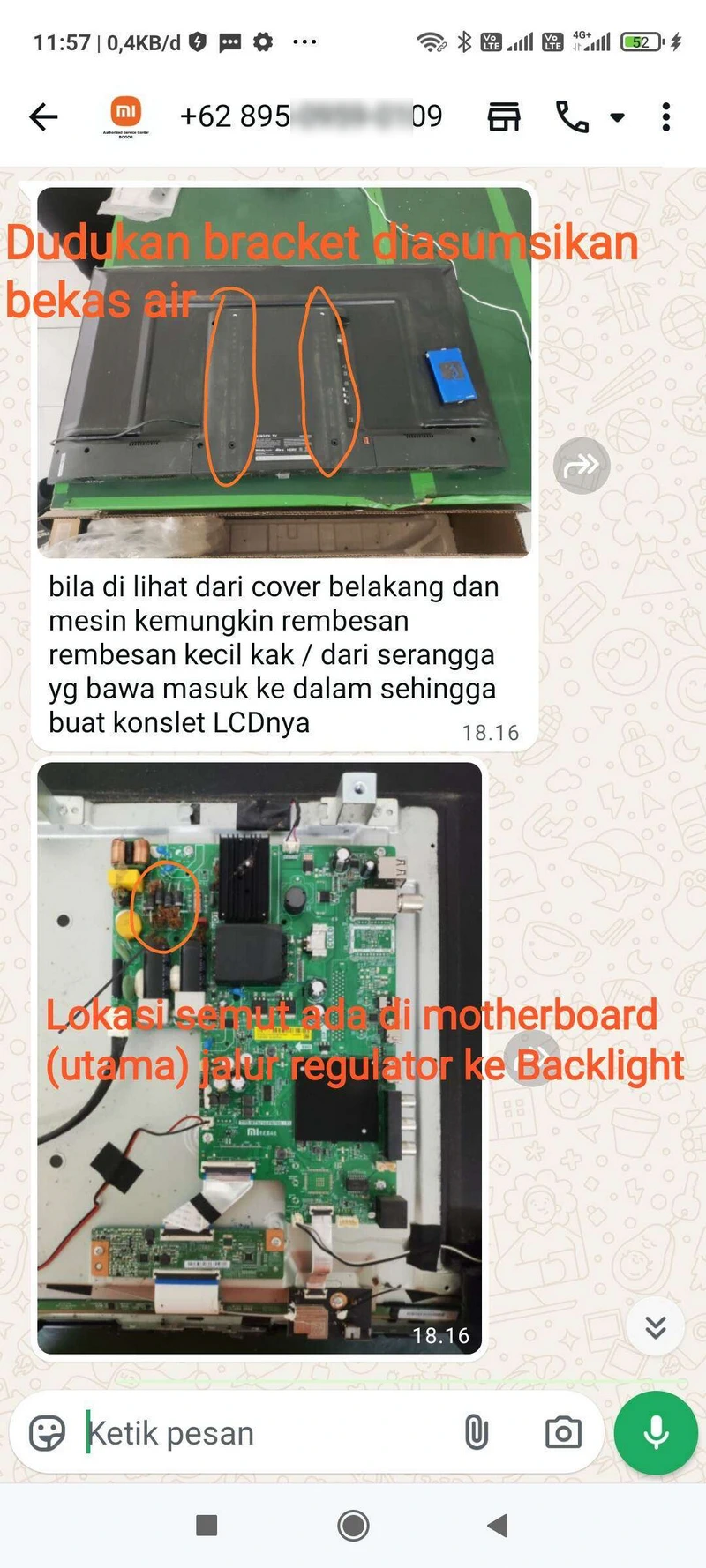 Setelah kami melihat video, posisi kumpulan semut ada pada bagian motherboard, tepatnya regulator lampu backlight, BUKAN berada pada area panel LCD yang rusak, yaitu bagian IC T-con pada board panel LCD. Ada bekas ceplakan dari dudukan bracket dinding, yang dianalisis sebagai bekas jalur air menurut pihak Xiaomi, seakan-akan mereka hanya mencari alasan untuk menolak klaim garansi.