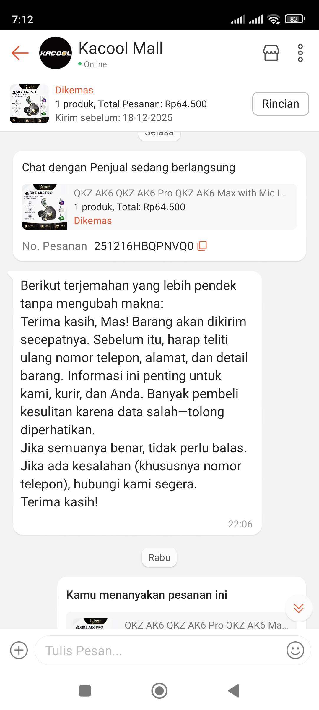 Pada tanggal 16 Desember 2025, saya melakukan pemesanan produk di toko KACOOL MALL STAR+ dengan memilih metode pengiriman SPX Instant. Harapan saya, paket dapat sampai di hari yang sama karena kebutuhan yang mendesak.