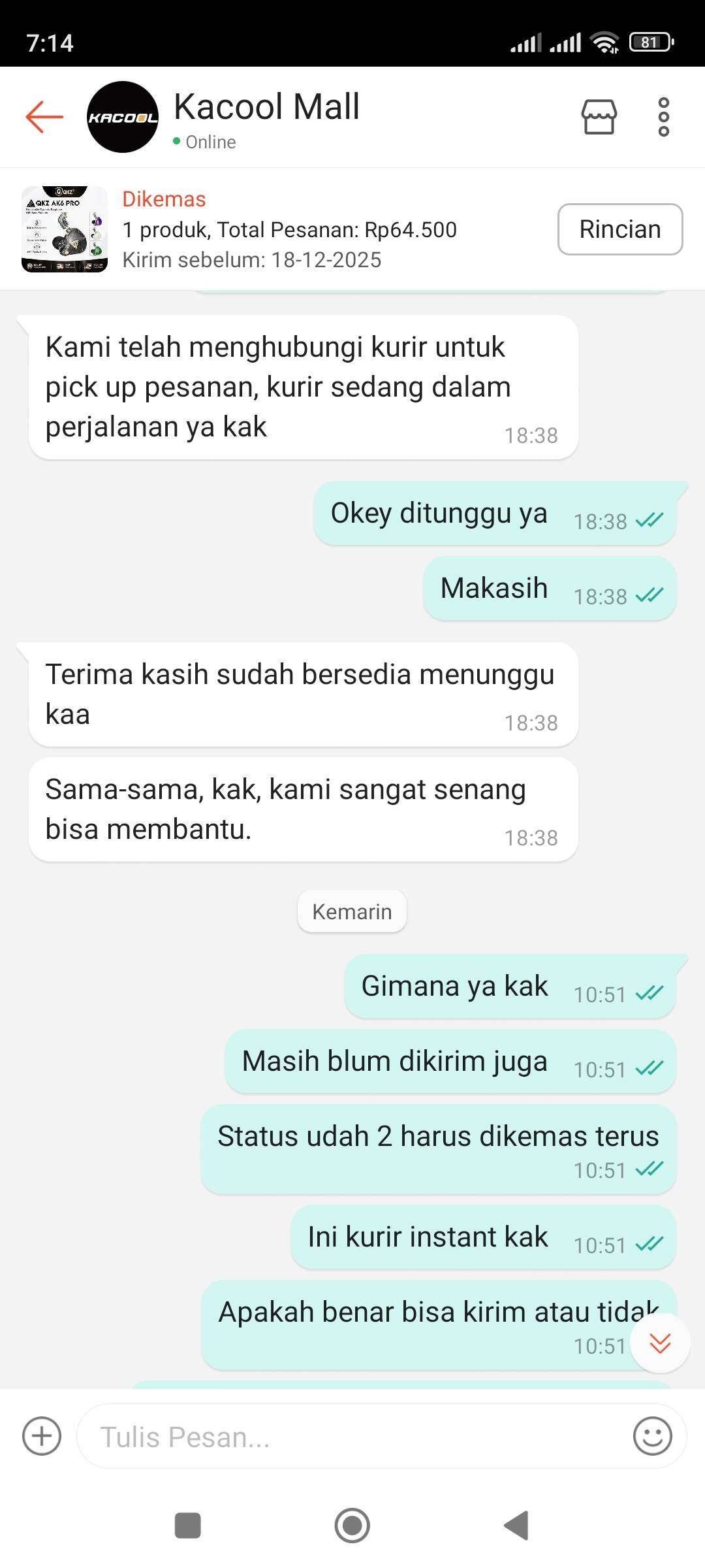 Selama masa tunggu tersebut, saya berkali-kali menanyakan status pengiriman melalui fitur chat. Pihak seller terus memberikan jawaban yang tidak sesuai fakta dengan mengatakan bahwa mereka “sedang menunggu kurir”. Padahal, berdasarkan sistem di Shopee, status pesanan masih “Sedang Dikemas”, yang berarti pihak seller belum melakukan permintaan pickup atau memproses pesanan sama sekali.