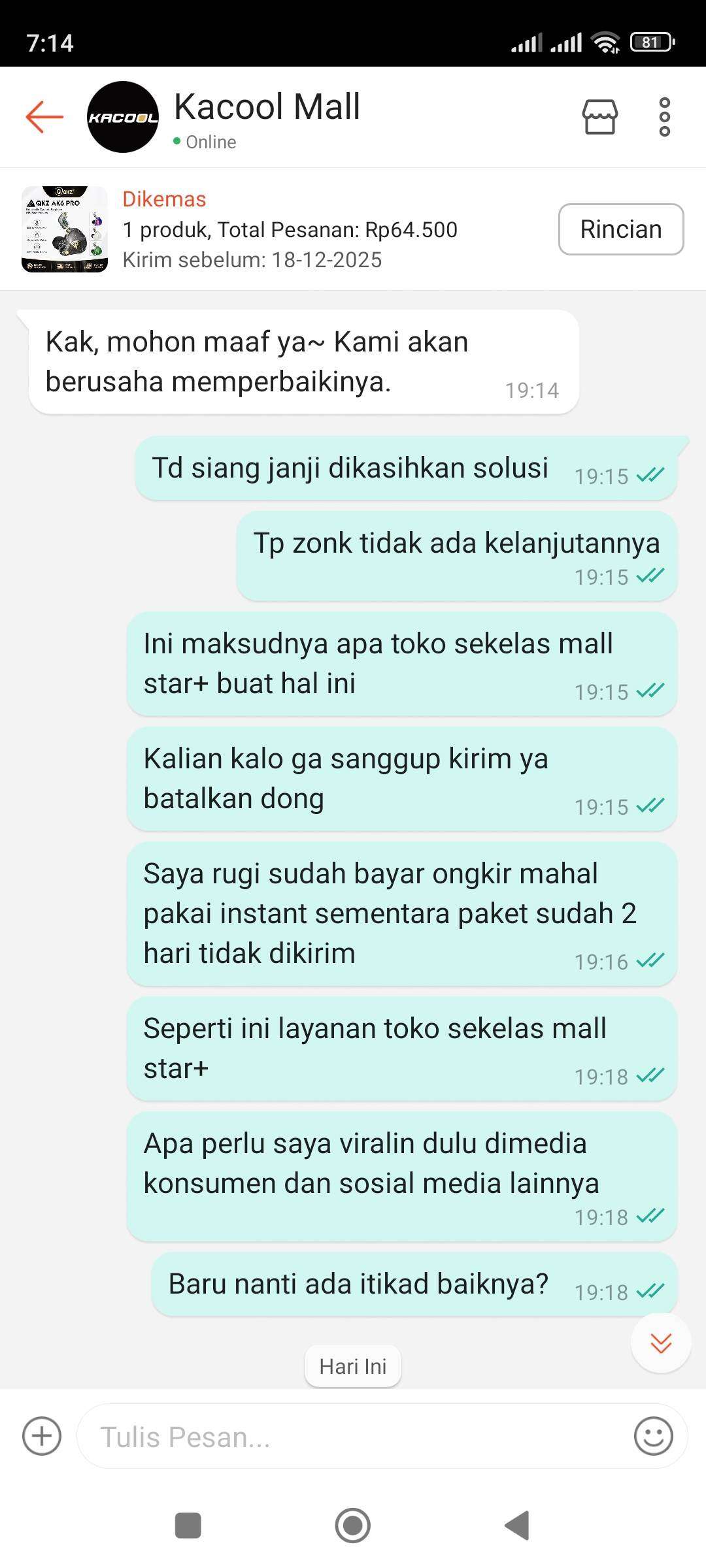 Kekecewaan Terhadap Layanan KACOOL MALL STAR+ dan Shopee, Pesanan Instant 4 Hari Tak Dikirim