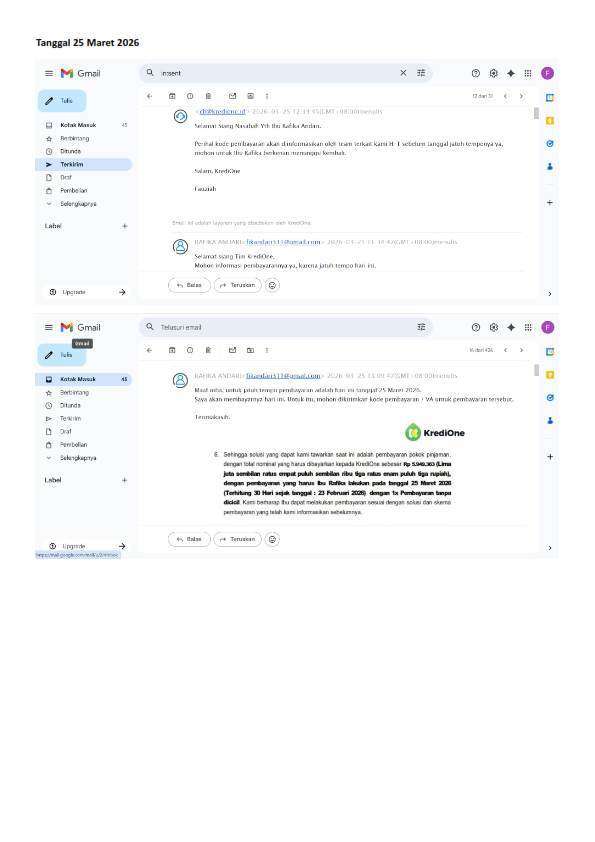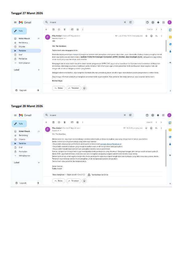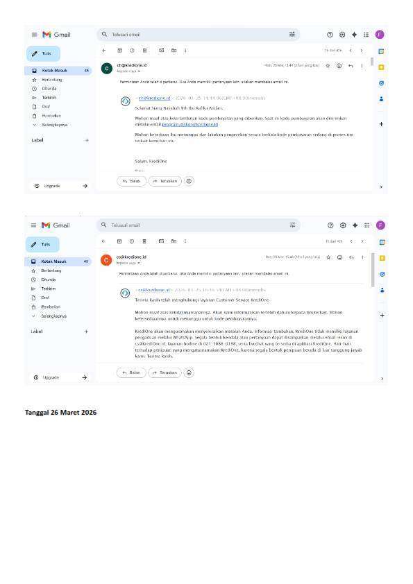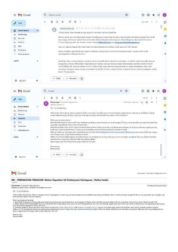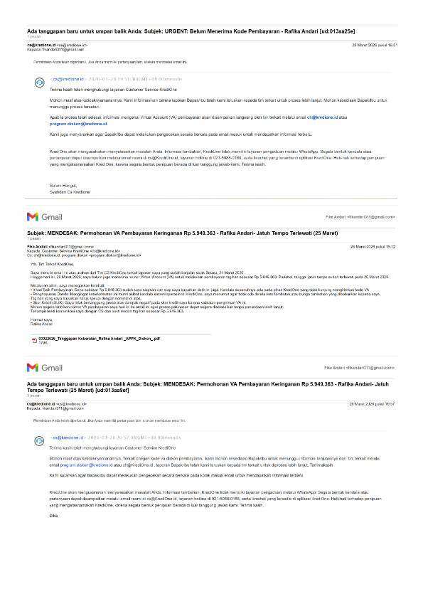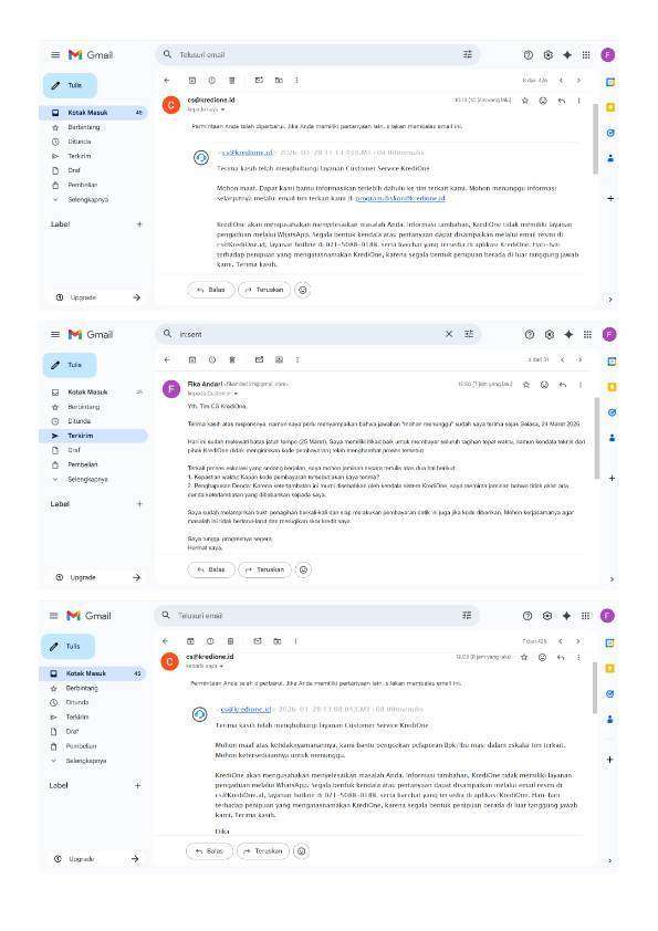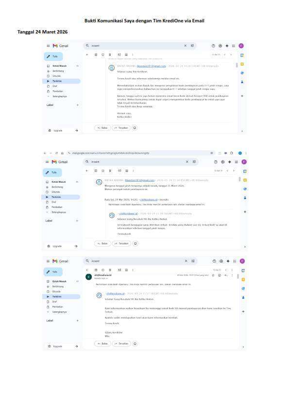 Saya sudah mengikuti prosedur dengan mengirimkan bukti penagihan berkali-kali ke cs@kredione.id, ch@kredione.id, dan program.diskon@kredione.id.