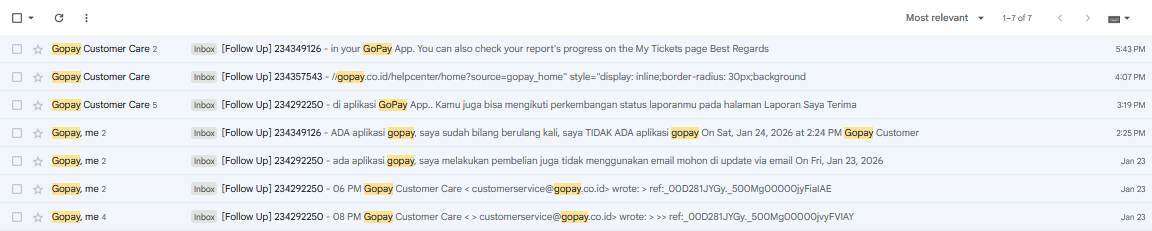 Berikut saya sertakan tangkapan layar percakapan email antara saya dengan customerservice@gopay.co.id.