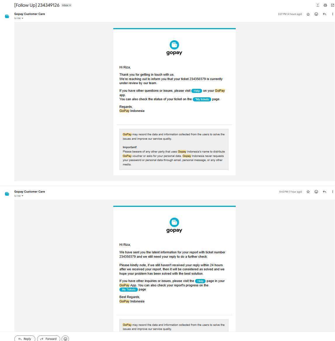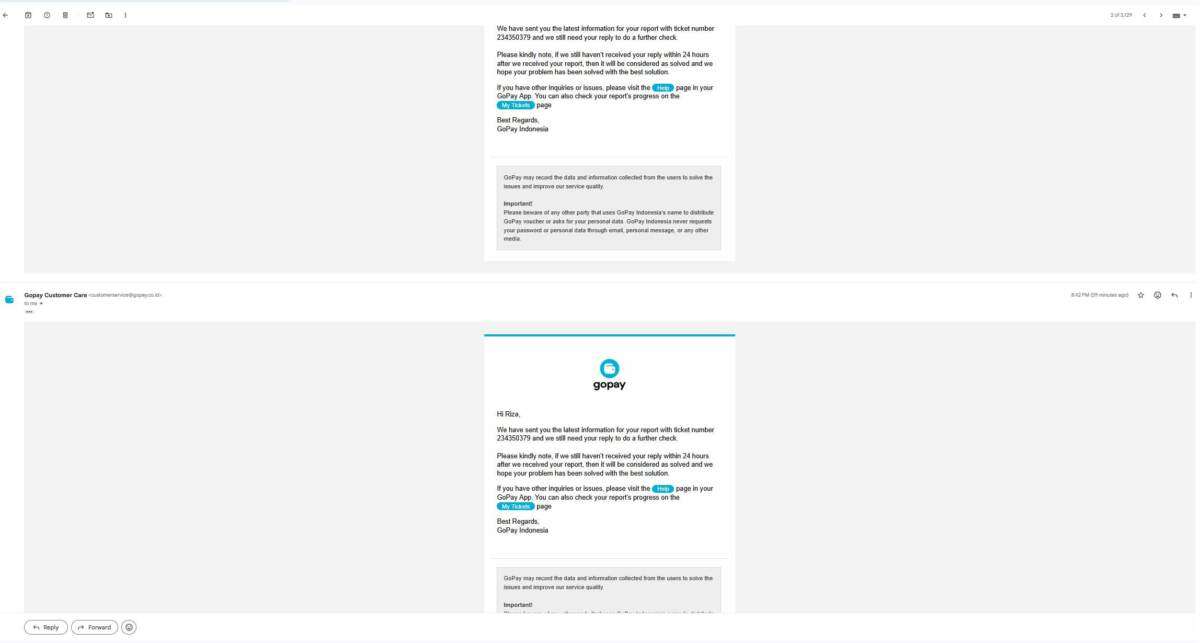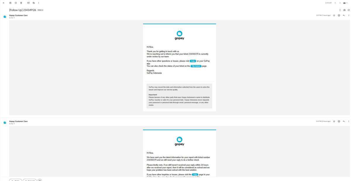 Namun, dari banyaknya email yang saya kirimkan, tanggapan dari customerservice@gopay.co.id tetap sama seperti email-email sebelumnya. Mereka kembali menerima permasalahan dengan nomor laporan baru, yaitu 234349126 dan 234357543. Dalam email tersebut dinyatakan bahwa saya belum me-reply dan memberikan informasi, serta apabila dalam 24 jam tidak ada informasi, maka permasalahan akan ditutup dan dianggap selesai. Hingga saat surat ini saya sampaikan, proses pengembalian dana tersebut belum juga terselesaikan.