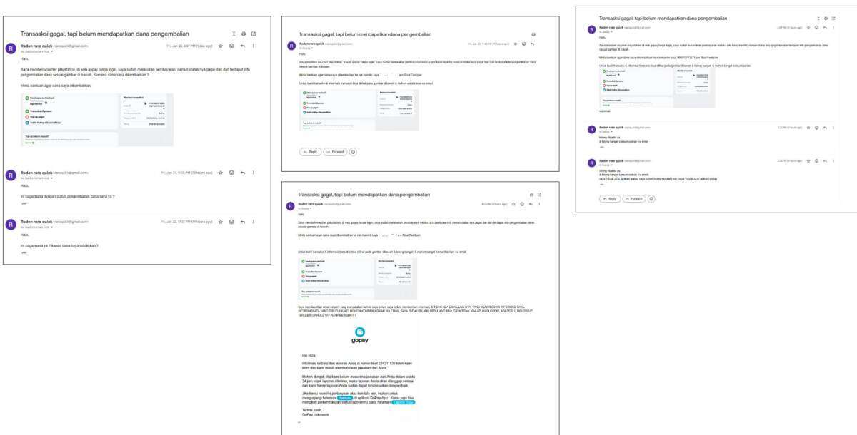 Pada hari yang sama, sekitar pukul 15.47, saya mengirimkan email pertama kali ke customer service gopay.go.id melalui email customerservice@gopay.co.id untuk mengajukan permohonan pengembalian dana. Dalam email tersebut, saya meminta pengembalian dana dengan menyertakan bukti transaksi dan memberikan nomor rekening saya. Pada awalnya, saya mendapatkan balasan email yang menyatakan bahwa permasalahan saya sedang direview oleh tim mereka dengan nomor laporan 234292250.