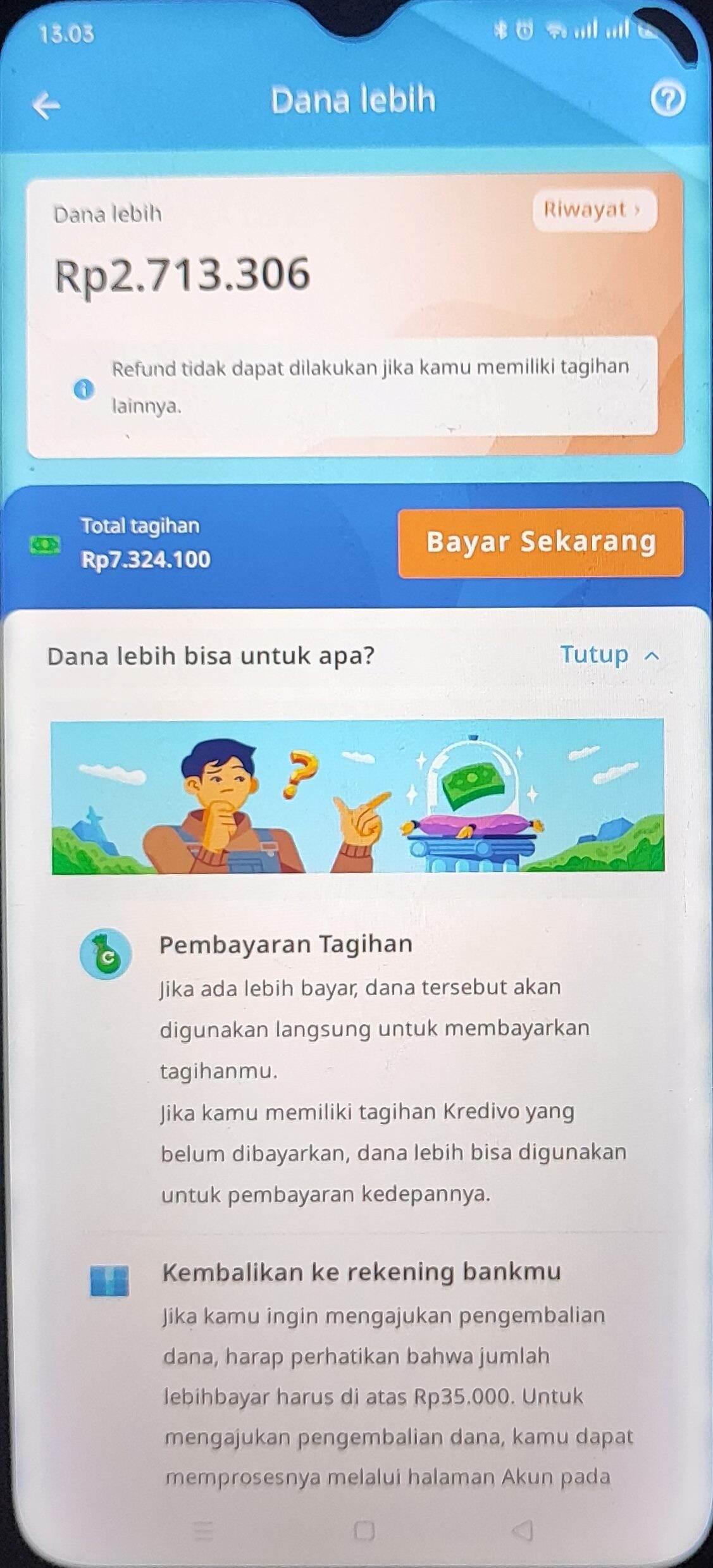 Saya mempelajari bahwa ketentuan Dana Lebih hanya dapat digunakan untuk pembayaran cicilan yang sedang berjalan atau dapat ditarik ke ATM pemilik akun dengan catatan tidak ada cicilan yang sedang berjalan di akun Kredivo.