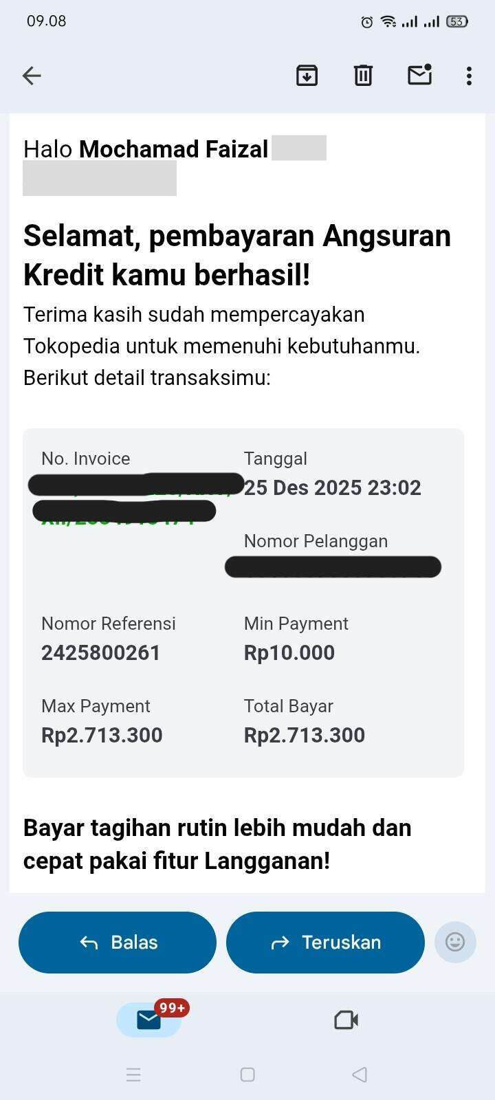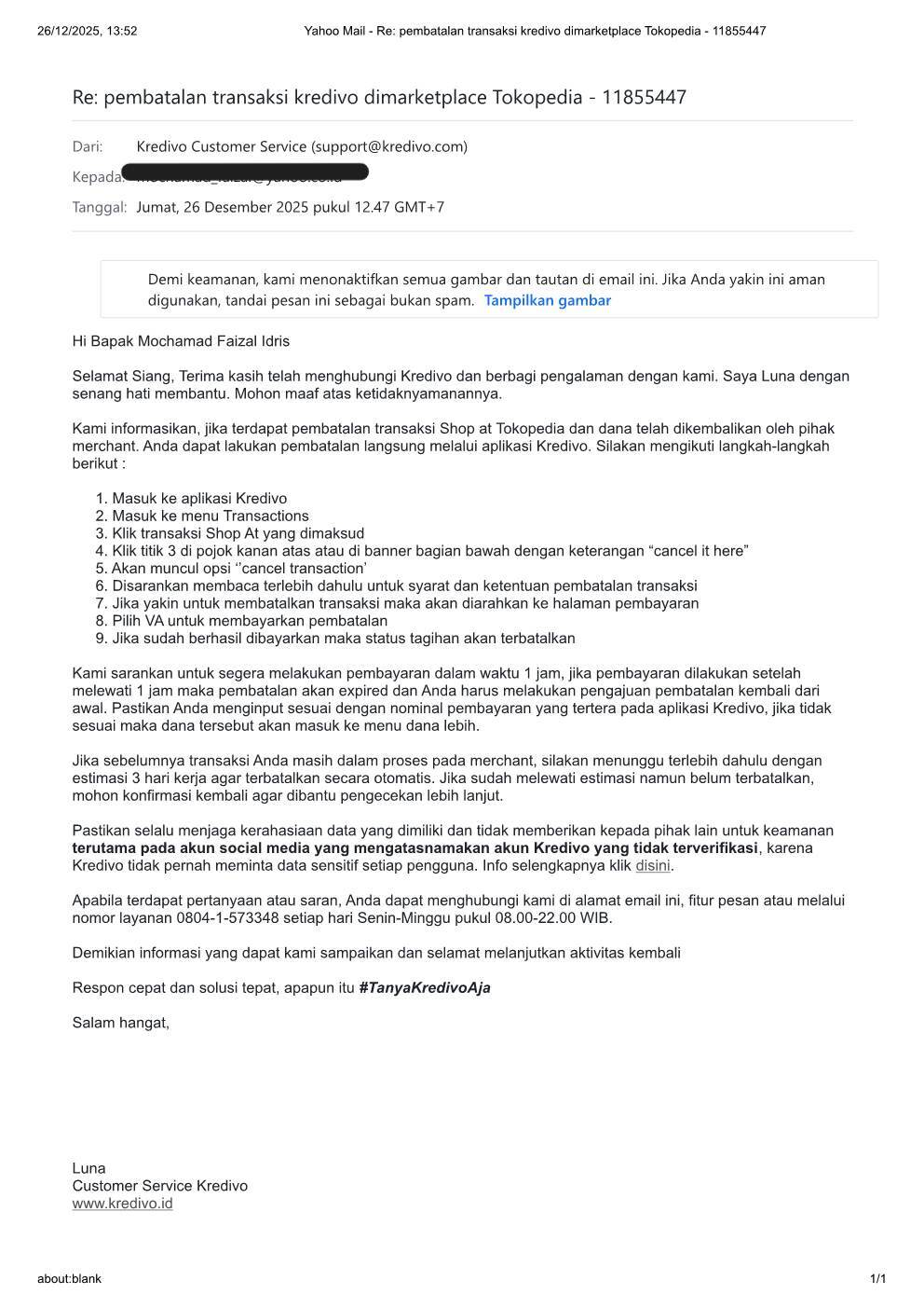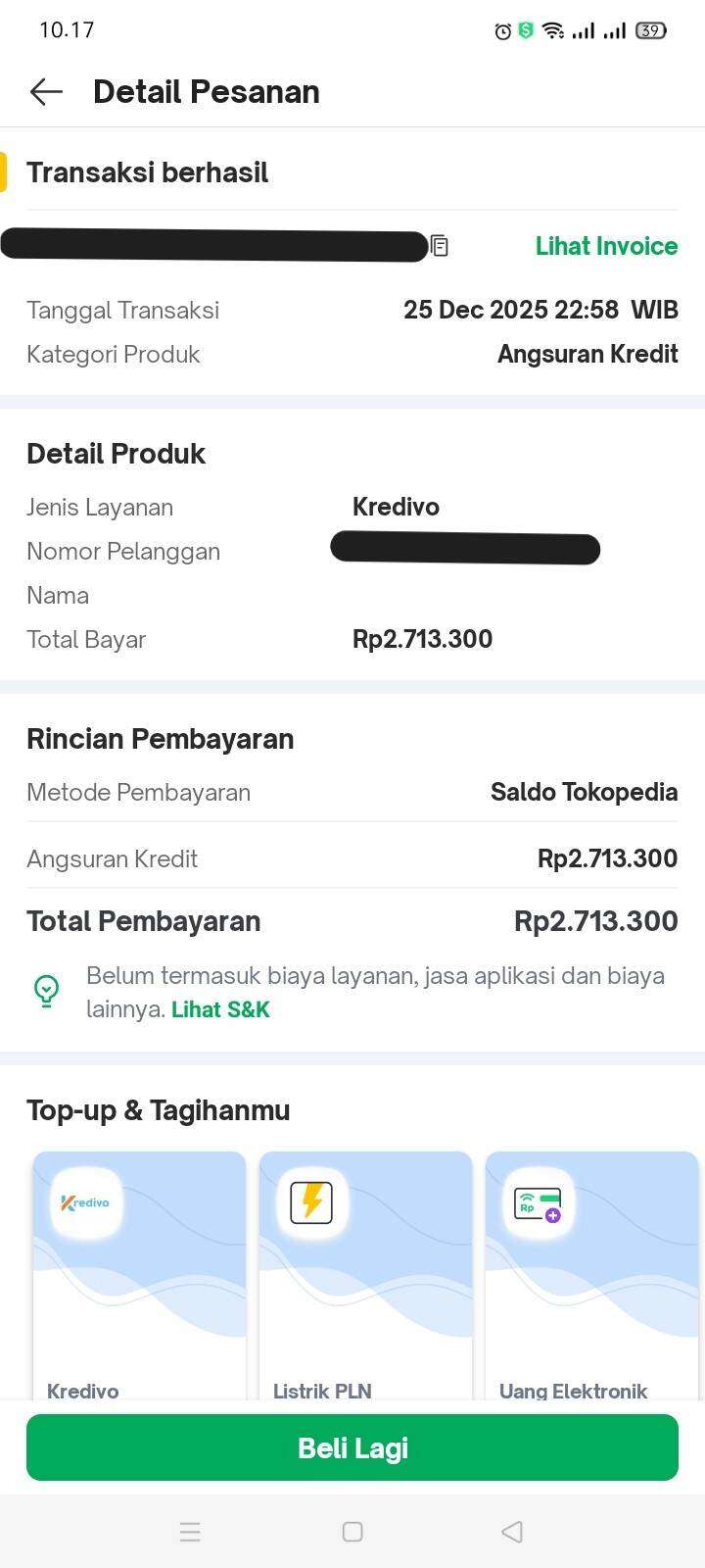 Pada tanggal 25 Desember 2025 sekitar pukul 22.30, saya melakukan pembelian di marketplace Tokopedia dengan metode pembayaran cicilan Kredivo tenor 24 bulan dengan ID transaksi 864287038. Bukti terlampir.