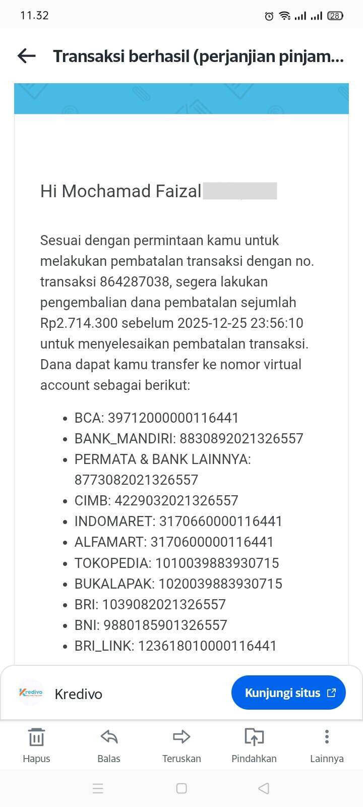 Kemudian, saya mengajukan pembatalan transaksi di aplikasi Kredivo dengan memilih metode pengembalian melalui transfer VA Tokopedia. Saya mengembalikan dana sesuai dengan uang yang masuk dari hasil proses pengembalian di Tokopedia sebesar Rp2.713.300.