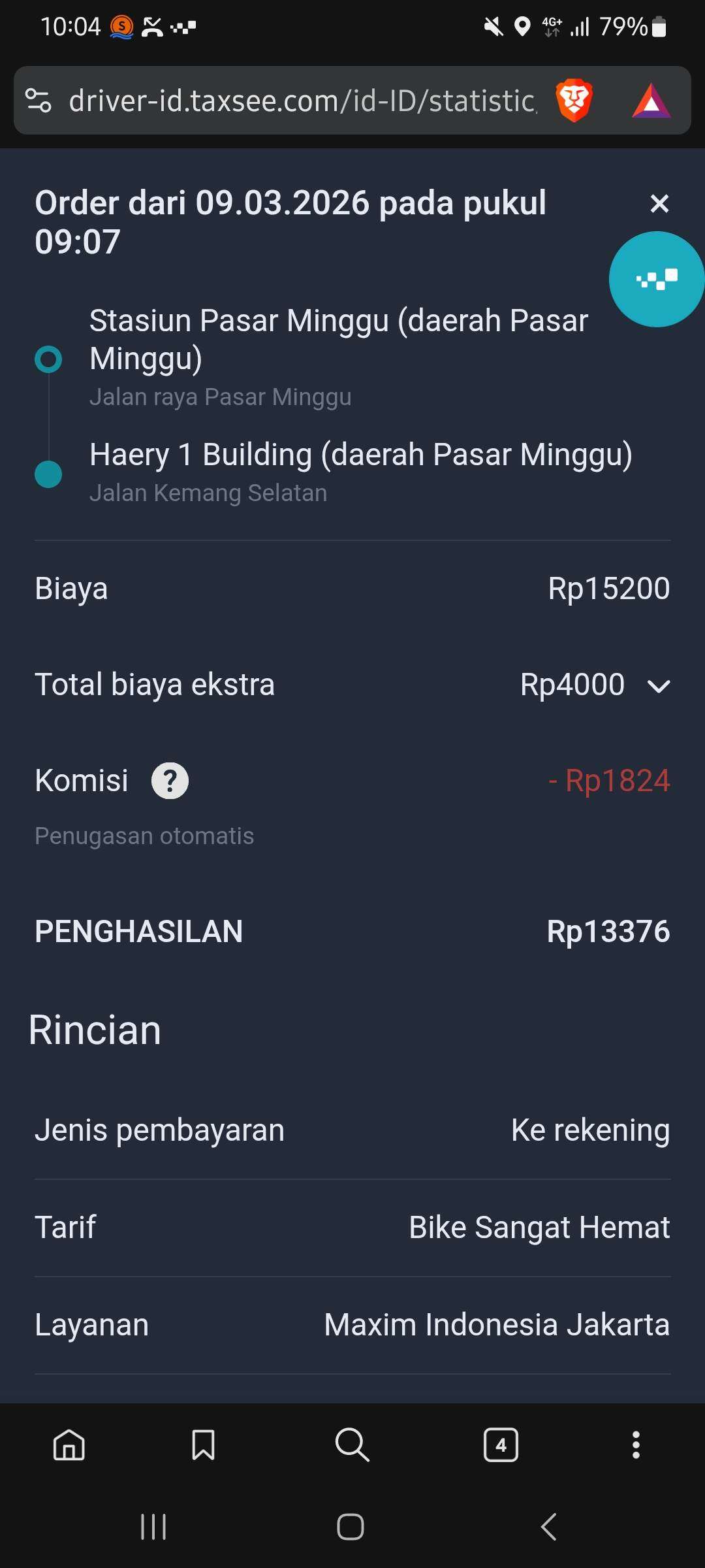 Perkenalkan, saya salah satu driver Maxim dengan ID 151287151. Pada tanggal 09 Maret 2026 saya mendapatkan order pengantaran penumpang dari Stasiun Pasar Minggu ke daerah Kemang dengan metode pembayaran non-tunai KasPro.