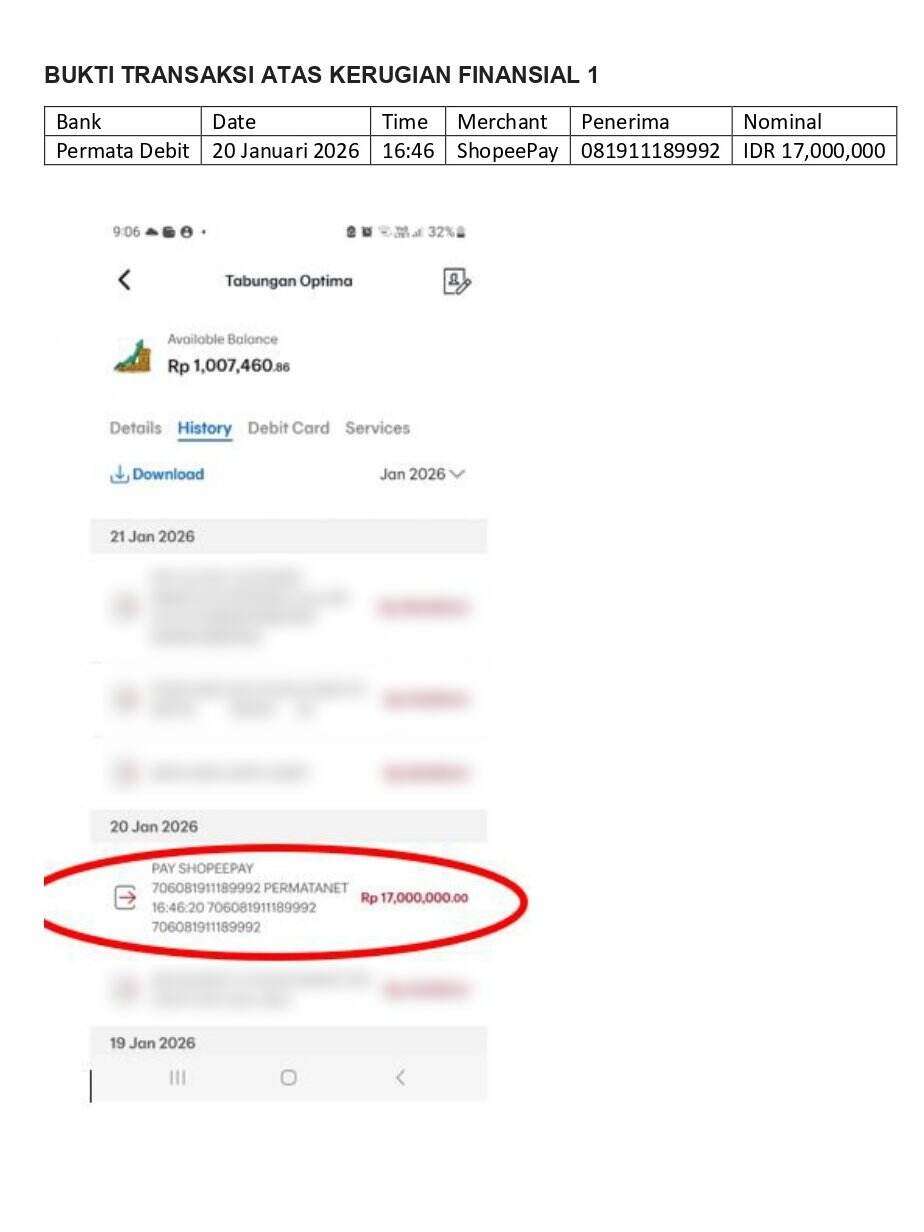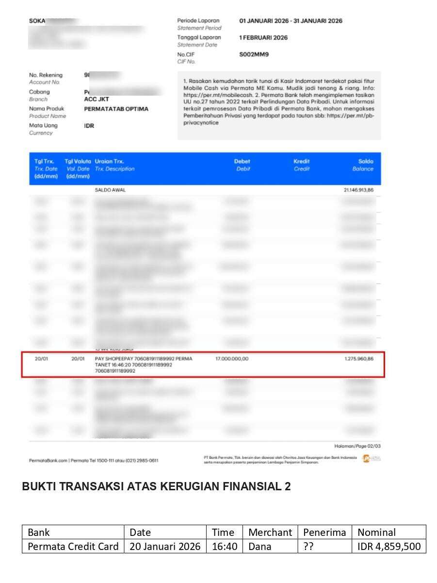 Akibat kejadian tersebut, dana pada rekening Permata saya telah ditransfer ke ShopeePay sebesar Rp17.000.000, dan kartu kredit BNI serta Permata saya juga digunakan untuk transaksi ke DANA sebesar Rp9.869.622 dan Rp4.859.500. Saya segera menutup telepon dan menghubungi call center Bank Permata serta BNI untuk melakukan pemblokiran kartu dan aplikasi.