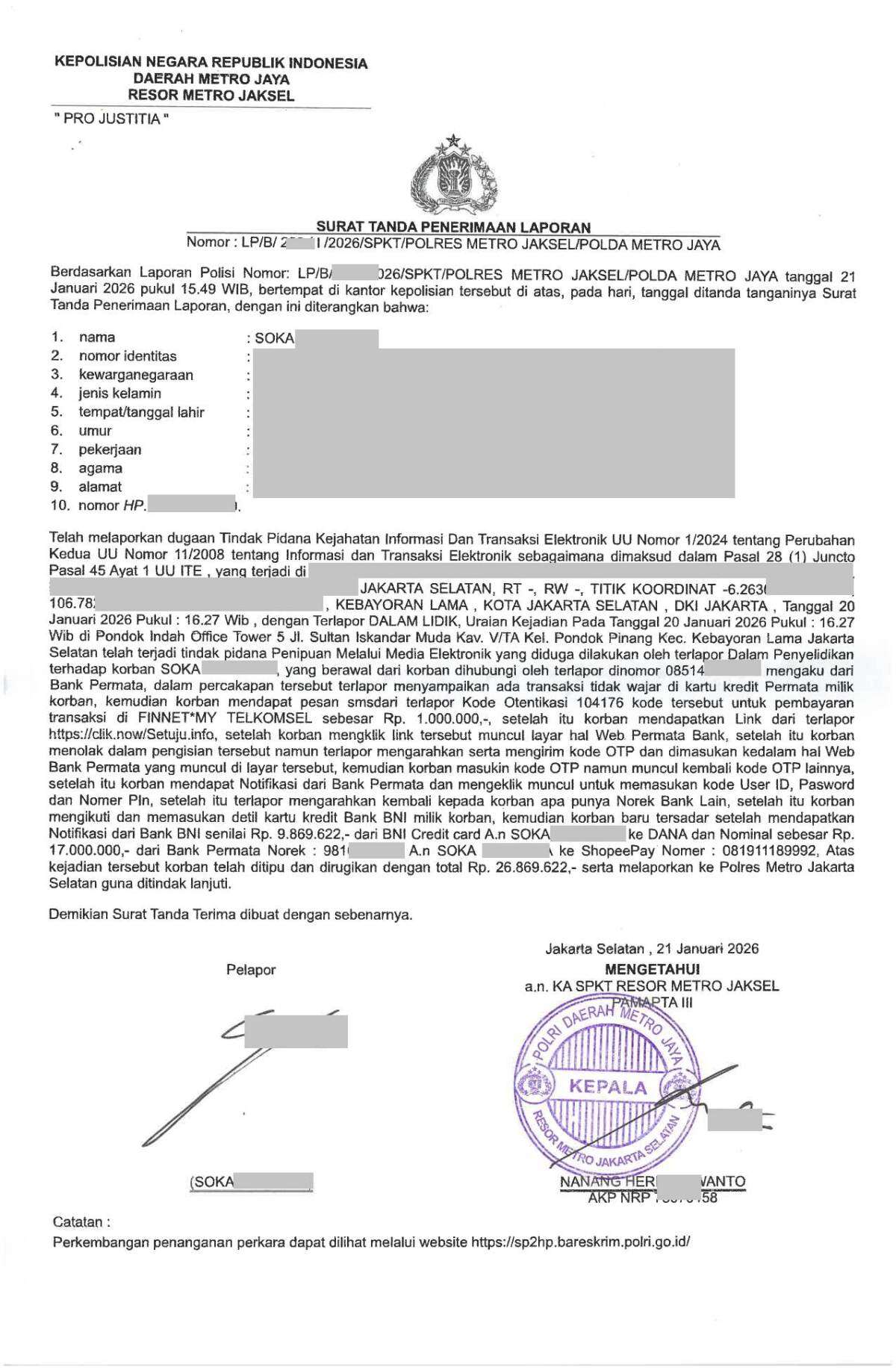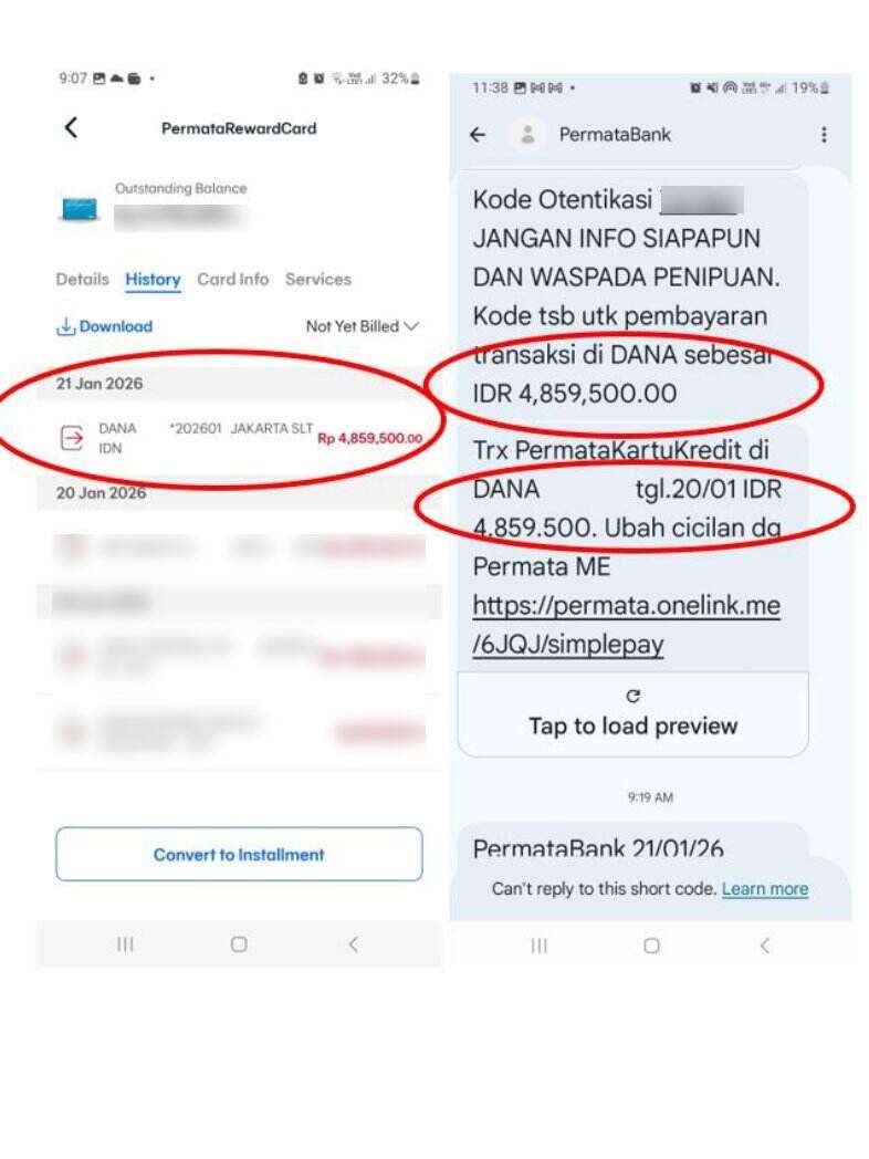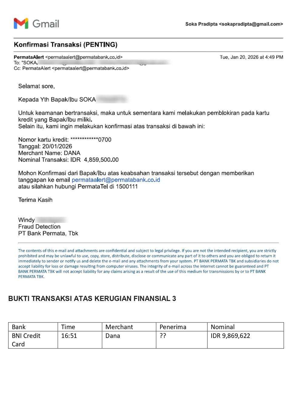 Kejadian bermula pada tanggal 20 Januari 2026 sekitar pukul 16.27 WIB, ketika saya dihubungi oleh seseorang yang mengaku sebagai pihak Bank Permata. Ia menginformasikan adanya transaksi tidak wajar pada kartu kredit saya. Untuk meyakinkan saya, pelaku meminta saya mengecek SMS dari nomor resmi Bank Permata, dan benar terdapat notifikasi berisi kode OTP dari beberapa merchant serta informasi transaksi kartu kredit.