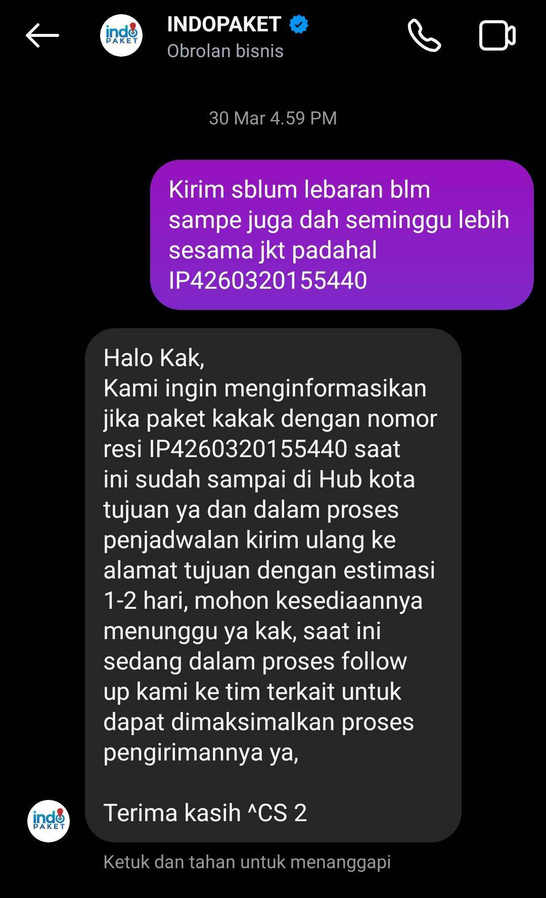 Saya sudah mencoba menghubungi Indopaket via chat WhatsApp, tapi hanya dapat balasan bot. Tidak sampai di situ, saya mencari akun Instagram Indopaket dan ternyata banyak pengguna lain yang mengalami hal serupa—bahkan kolom komentar akun Indopaket sudah dibatasi. Saya mencoba DM admin untuk mengetahui perkembangan paket saya, tapi hanya disuruh tunggu dan hingga saat ini belum ada kabar lagi soal keberadaan paket saya.