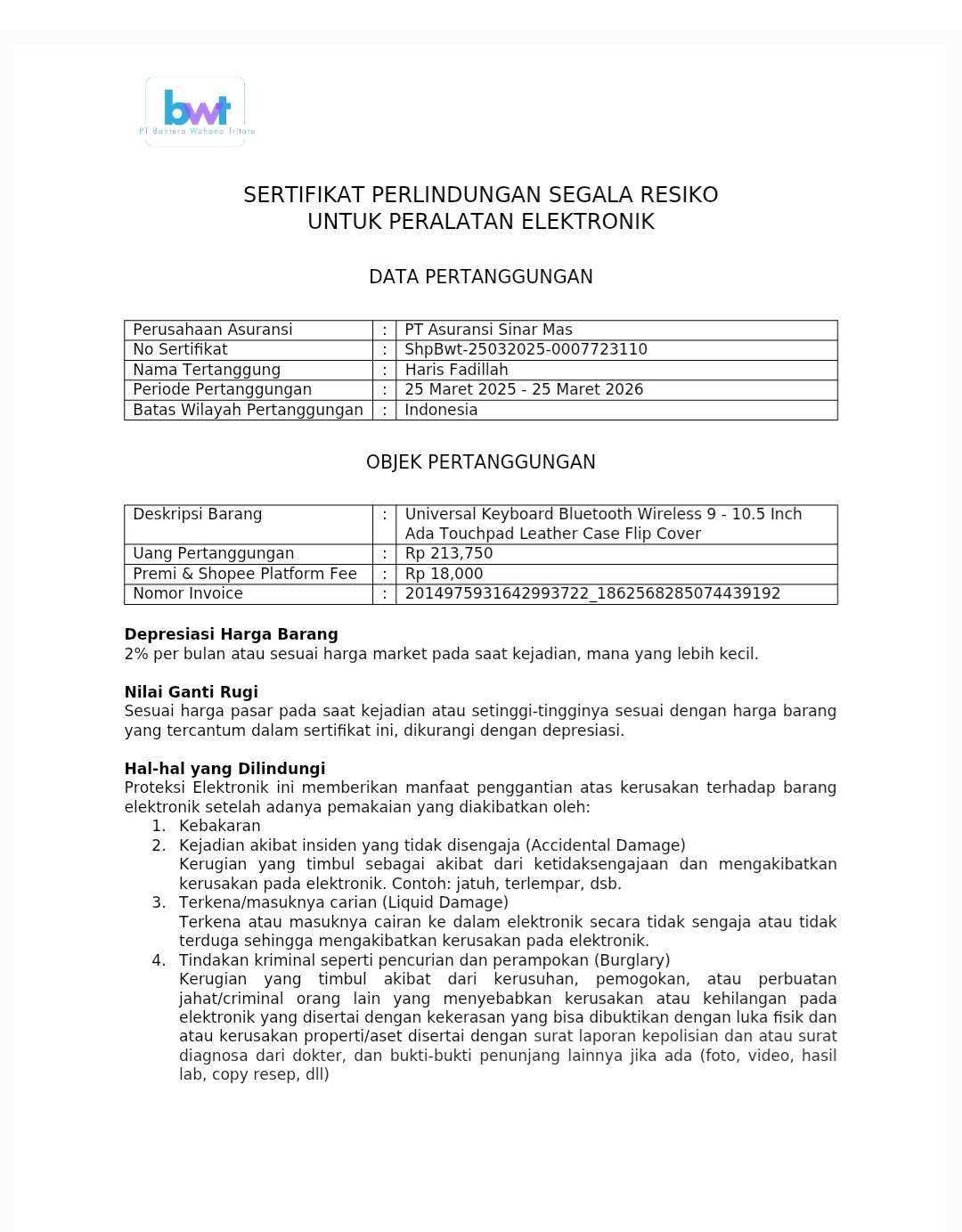 Pada tanggal 25 Maret 2025, saya membeli produk keyboard untuk tablet melalui Shopee dan sekaligus membeli asuransi yang tersedia di halaman pembelian produk tersebut.