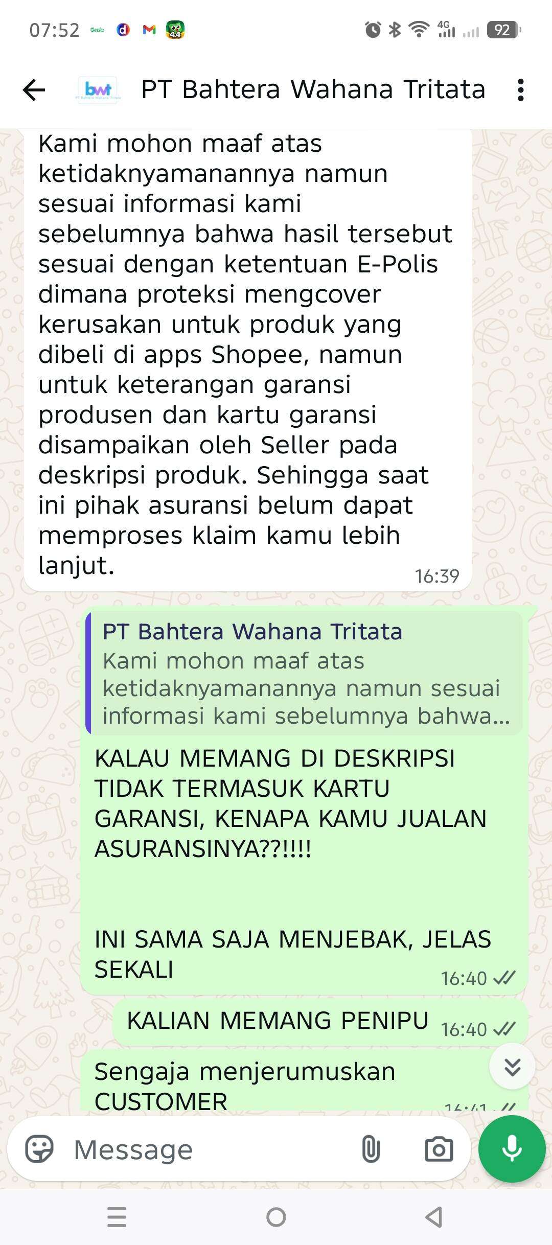Menurut saya, ini benar-benar menjebak pelanggan. Sejak awal, pihak BWT dan Simas tampaknya dengan sengaja berniat tidak baik demi meraup keuntungan semata, karena tetap menjual produk asuransi untuk barang yang tidak disertai kartu garansi—sementara kartu garansi itu sendiri mereka jadikan syarat diterimanya klaim. Artinya, tidak akan ada pelanggan yang bisa mengklaim asuransi tersebut.