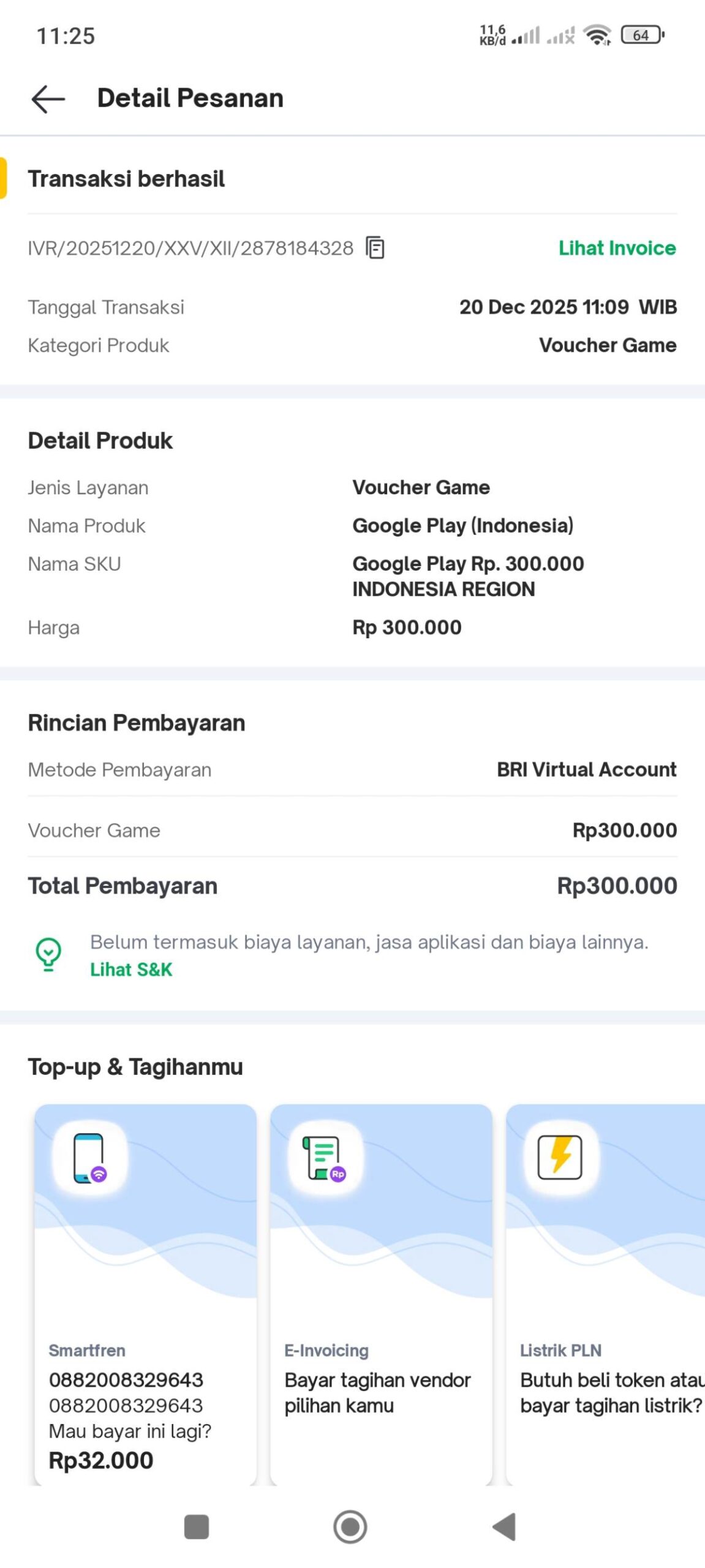 Tidak lama setelah saya melakukan pembayaran, status pembelian saya dinyatakan berhasil. Di halaman daftar transaksi di Tokopedia, pesanan saya juga berstatus berhasil. Namun, ketika saya membuka detail transaksi tersebut, tidak tercantum kode voucher. Padahal, kode tersebutlah yang nantinya akan saya gunakan untuk diredeem di Play Store. Bukti transaksi dan pembayaran tersedia lengkap.