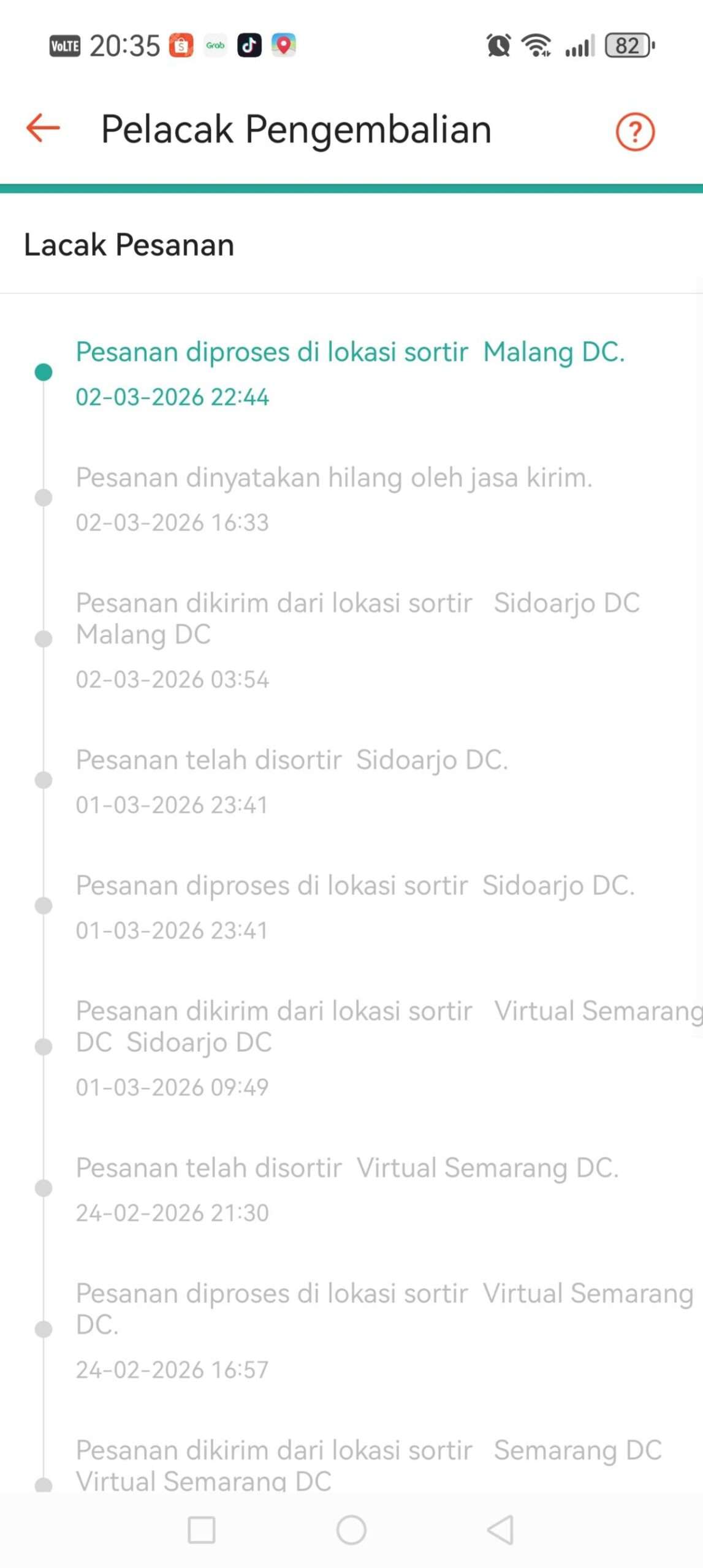 Tanggal 2 Maret 2026 pukul 16.33 tiba-tiba barang dinyatakan hilang. Akan tetapi pada tanggal 2 Maret 2026 pukul 22.40 status barang diproses di DC (yang artinya barang masih ada).