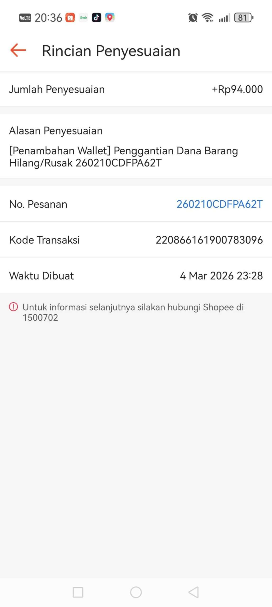 Namun karena SPX overload, akibatnya barang terlalu lama di ekspedisi. Akhirnya sampai estimasi batas akhir penerimaan barang, barang belum sampai di saya, tetapi secara otomatis dinyatakan hilang. Uang dikembalikan ke buyer penuh, dan saya diganti kompensasi Rp94.000 (10x ongkir).