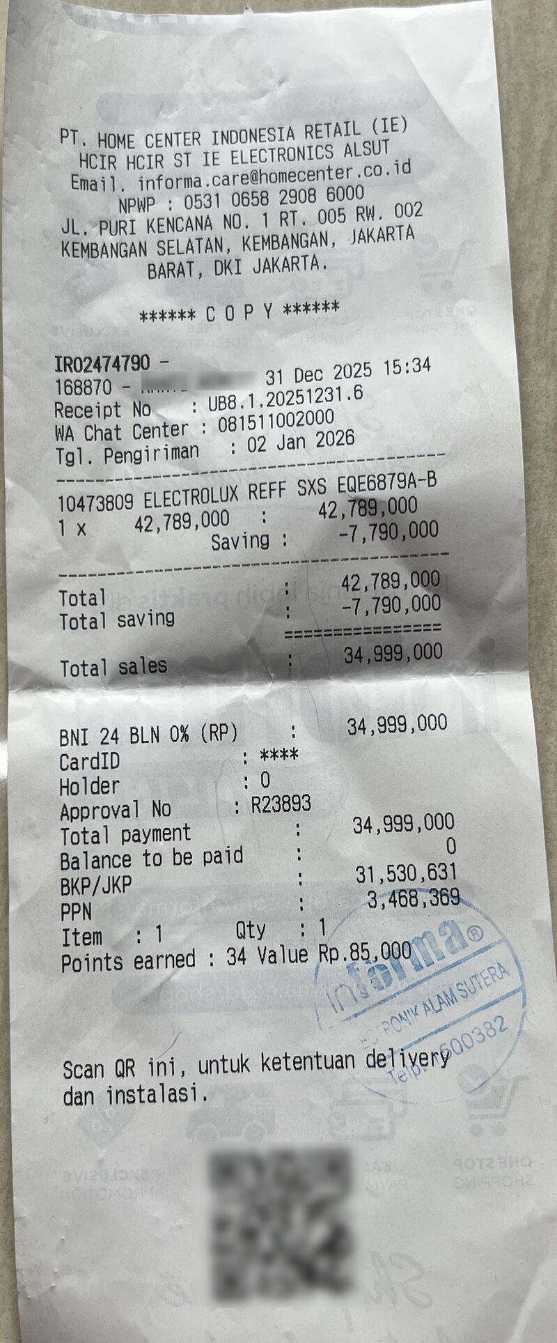 Pada tanggal 31 Desember 2025, saya membeli kulkas Electrolux EQE6879A-B seharga Rp34.999.000 di Informa Elektronik Living World Alam Sutra. Sejak hari pertama dinyalakan, sudah muncul masalah; dispenser kulkas tidak bisa mengeluarkan air.