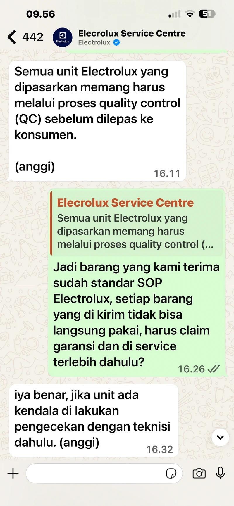 Kami pun menghubungi sales Informa dan customer care Electrolux. Teknisi yang datang mengatakan bahwa pompa air bermasalah. Kami perlu mengklaim garansi dan melakukan servis, dan dijanjikan akan dihubungi. Namun, kenyataannya, kami baru dihubungi setelah melakukan follow up. Solusinya adalah menunggu pengadaan suku cadang.