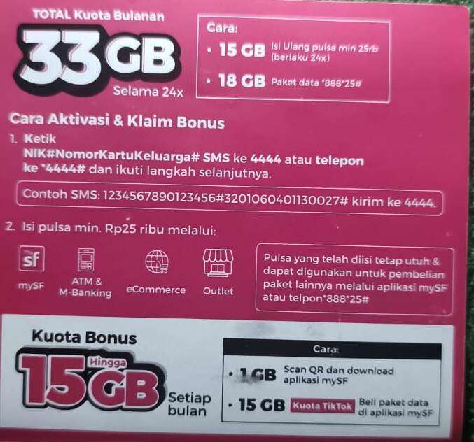 Noted: Kuota bonus 15GB bisa didapatkan jika melakukan isi ulang maksimal 7 hari setelah aktivasi (jika tidak, akan hangus kuota bonusnya).