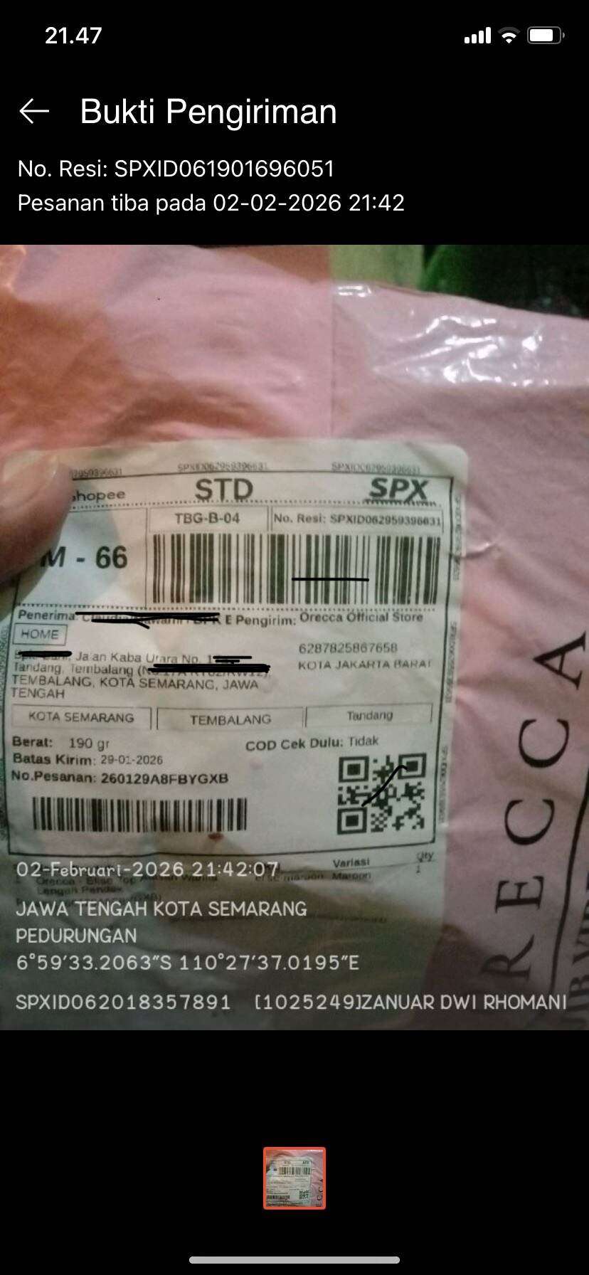 Pada tanggal 2 Februari 2026 pukul 21.42 WIB, kurir dari SPX yang merupakan mitra Shopee menyatakan pesanan tiba dan melampirkan bukti foto paket saya. Ada kejanggalan pada foto tersebut, yaitu lokasi foto yang otomatis muncul. Alamat saya di daerah Kedungmundu, Kecamatan Tembalang, tetapi kurir menyatakan pesanan tiba di daerah Pedurungan dalam lokasi yang tertera di foto tersebut. Daerah lokasinya saja sudah berbeda.