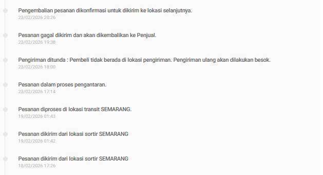 Baru pada tanggal 23 Februari 2026 pukul 17:14 status pengiriman berubah menjadi “pesanan dalam proses pengantaran”. Akan tetapi hanya berselang sekitar 46 menit kemudian, pada pukul 18:00, status berubah menjadi “pengiriman ditunda: pembeli tidak berada di lokasi pengiriman dan akan dilakukan pengiriman ulang besok”.