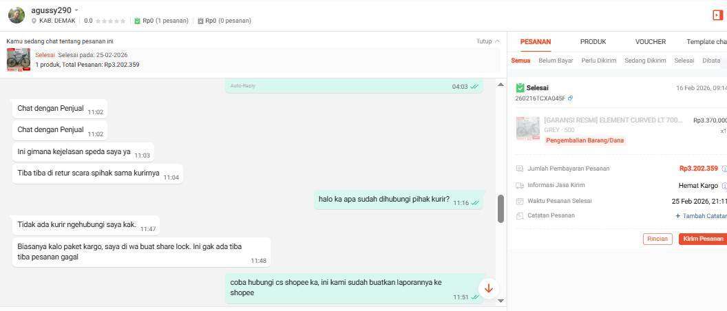 Saya sudah mencoba mengajukan laporan melalui layanan pelanggan Shopee dengan nomor laporan 2028351288889303121. Namun laporan tersebut ditutup karena barang sudah kembali kepada seller, dan Shopee lepas tanggung jawab dengan mengarahkan untuk menghubungi pihak ekspedisi secara langsung.