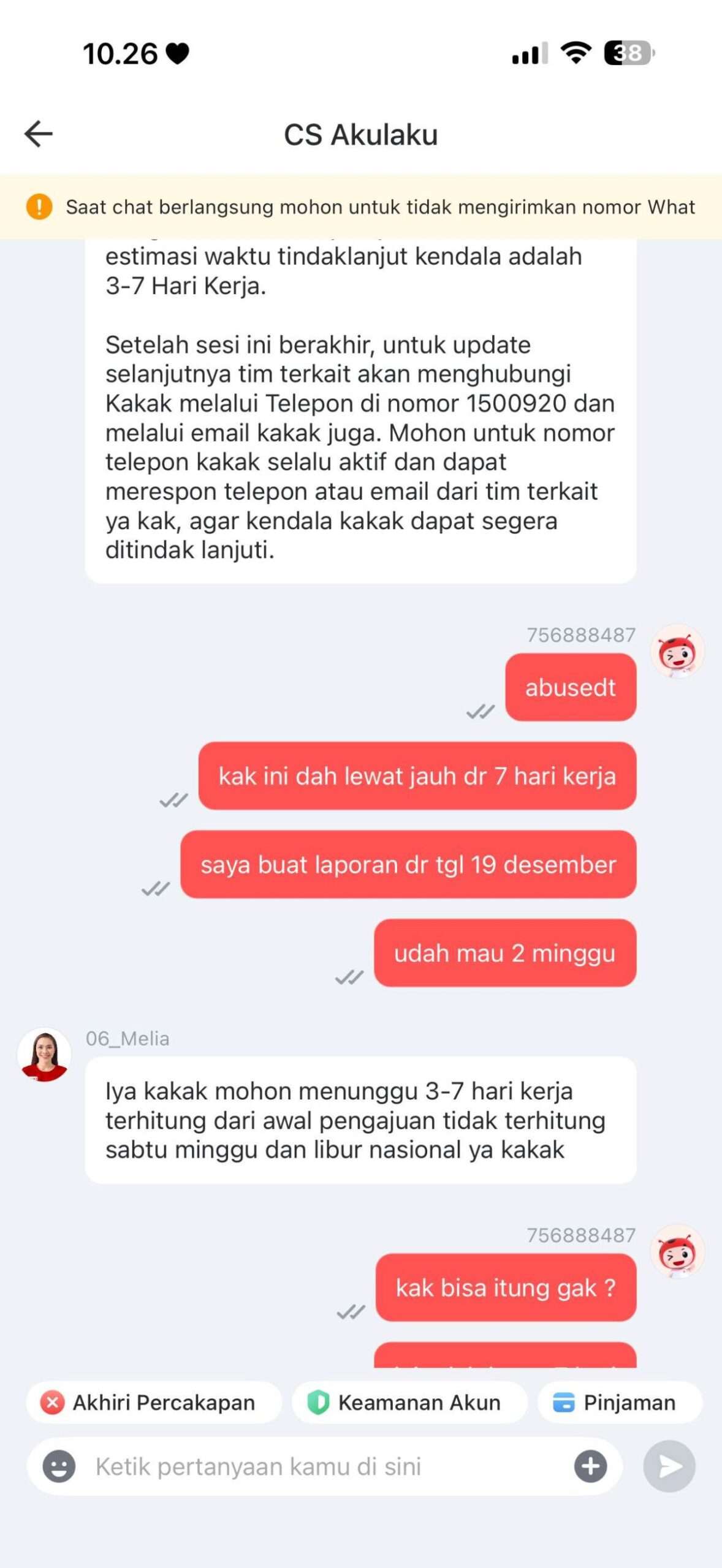 Saya sudah menghubungi CS Akulaku, tetapi jawaban yang diberikan selalu berupa template. Pihak Akulaku memberikan estimasi penyelesaian 3–7 hari. Namun sampai hari ini, 6 Januari 2026, kendala saya belum juga terselesaikan.