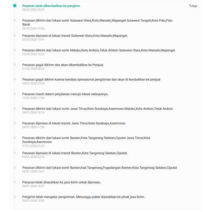 Pada tanggal 1 Februari 2026, ada update lagi dengan status “Pesanan gagal dikirim dan akan dikembalikan ke Penjual”, kemudian pada hari berikutnya, 2 Februari 2026, ada update dengan status “Pesanan dikirim dari lokasi sortir Maluku, Kota Ambon, Teluk Ambon, Sulawesi Utara, Kota Manado, Mapanget”.